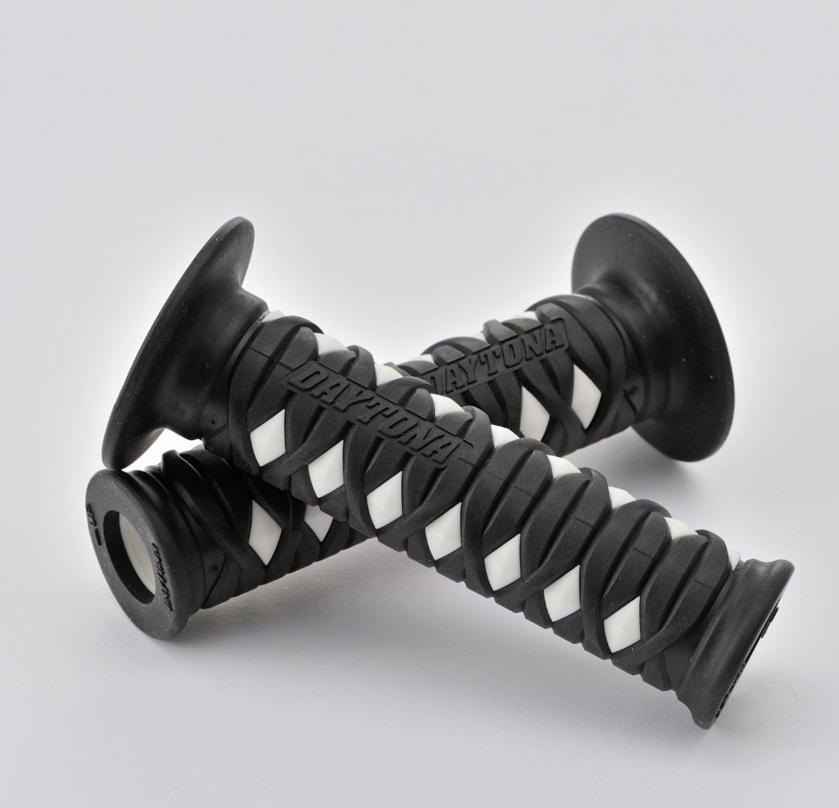 シンプルなピラミッド構造で人気のデザイン。突起を一般的サイズより大きくすることで、エッジを効かせています。φ22.2ハンドル用全長:120mmエンド貫通※確実に取り付けるため、グリップボンドを使用してください。セーフティワイヤーを併用すると、より効果的です。※純正スロットルスリーブがリブ付構造の車両はリブを削ってください。