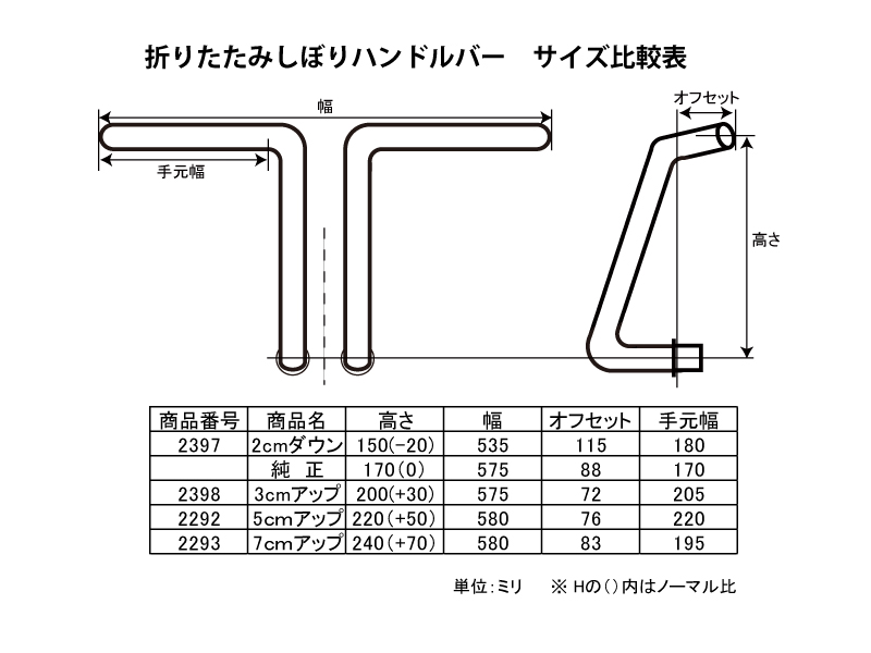 【サイズ詳細】幅 565mm(取り付け時の最大幅)-純正575mm高さ 200mm(取り付けホルダーねじ芯〜ハンドルバーにぎり芯)-純正170mmオフセット 72mm(取り付けホルダー根元〜バーエンド)-純正88mmバー握り部分の長さ 205mm-純正170mm【詳細など】スチールパイプ仕様純正ハンドルより、『しぼりを強調』左右ハンドルピッチ芯〜芯100mm※純正ハンドルホルダー使用できます。取り付けの際、個体差によりバー差し込み口がホルダーと干渉する場合には、軽くグリスを塗ってください。注:画像にあるハンドルポストとノブは付属しません。