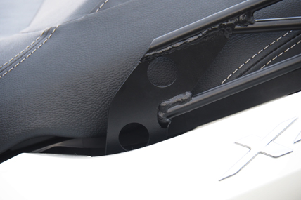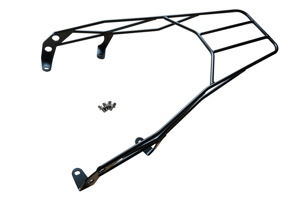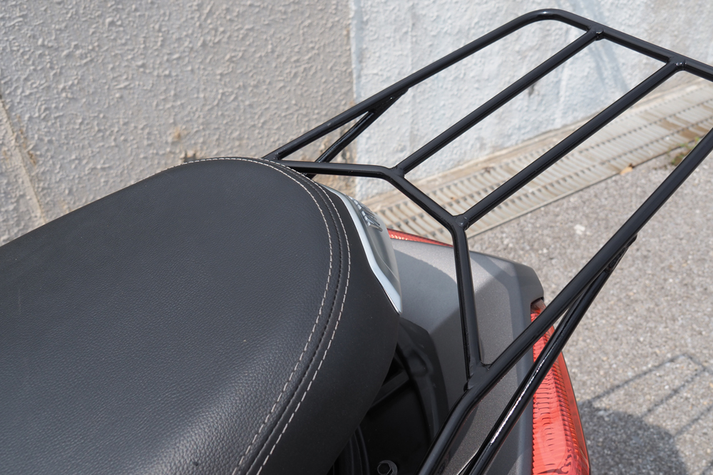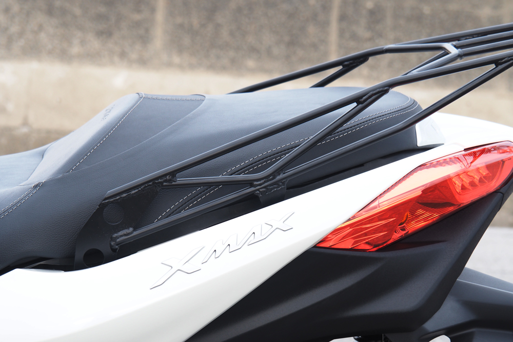 付属品:取り付けボルト一式【ステンレス】・カラー:ブラック・素材:スチール・最大積載量:5kg環境性能と加速性能をあわせ持った新型エンジン「BLUE CORE」を搭載し、ABSやTCS、ACジャックなど実用機能もバランスさせたXMAX。ビッグスクーターブームを牽引したヤマハのマジェスティやマグザムに比べるとデザインも一新され新しい時代のビッグスクーターの形を感じさせます。シート下のラゲッジスペースも45Lと大容量ですが、更に40L級のリアボックスを装着すれば積載性は無双の領域に。走りのXMAXのイメージを崩さないシャープデザインのリアキャリアを目指して開発しました。素材はワールドウォークのリアキャリア素材としては一般的なスチールの丸棒を採用。細い丸棒を組み合わせて補強を入れる事で強度を確保しています。塗装は黒のウレタン塗装を採用しています。【カウルにあわせて一体感を強調】テールカウルの上向きに跳ね上がっているデザインにあわせてリアキャリアもデザインしました。【天板の長さはデザインと機能性を調整】天板のサイズは長さを充分に確保しつつリアフェンダーよりも内側に納まるようにする事で見た目とのバランスを調整しています。【取り付け部分をデザイン性と軽量化のために肉抜きを実施】取り付けステー部分強度を確保しつつ軽量化のために丸く肉抜きしています。一枚の板に比べて見た目にも優れ機能性、見た目のどちらにも貢献しています。【天板を支える足の部分にはV字型に補強を採用】取り付け位置の関係で天板を支える足の部分はやや長めの設計になってしまったので補強をV字型に入れています。走行時に多少タワミますが力を逃がすためで「折れ」や「曲がり」のリスクを減らしています。【天板の位置はシート開閉時に邪魔にならない】シート開閉時に邪魔にならないように天板の位置をやや後ろに配置。更にリアボックスを装着してもパッセンジャーが窮屈にならないように天板は長めに設計しました。【最大積載量は5kg】最大積載量は40L級リアボックスも対応可能な5kg。沢山の荷物を積載する事が可能です。・設計/開発:日本・製造:台湾