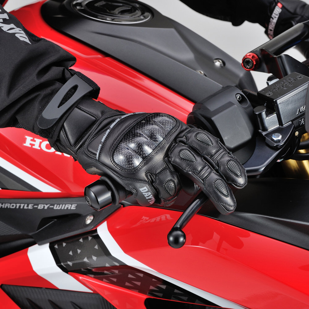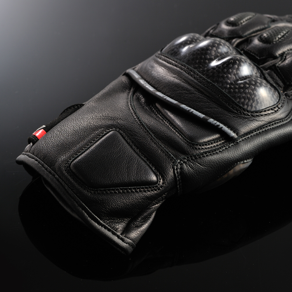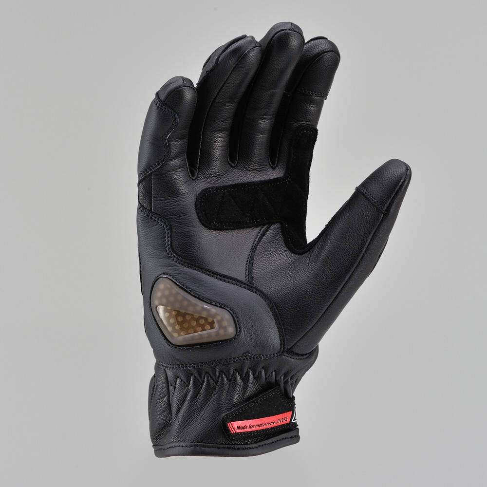 表裏の革厚を使い分け、手の甲や小指は厚く、手の平は薄くし安全性とフィット感を両立。ライディングに適した立体パターン+シャーリングで操作性向上。ナックルガード+パームスライダー+クッションパッド+本革による高い保護性能。指は全て内縫いで高い耐久性。人差し指の周囲までスマホタッチ対応。素材:本革(やぎ革)/プロテクター(カーボン)MENS通年用