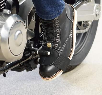 ブーツやシューズのシフトペダルがあたる部分からクランクケースのあたる内側部分までを広く覆うシフトガード。滑り止めや脱落防止ボタンつきで、出来る限りシフトロスや装着感がないように独自の形状に設計したライディング時のシューズの必需品。 靴の消耗を防ぎます。紐靴専用設計で脱落の心配がいりません。 ※生産ロットにより、色合いが異なる場合があります Mサイズ-底の薄いスニーカーなどLサイズ-底の厚いブーツなどMATERIAL:牛革