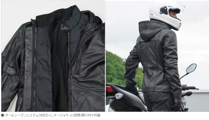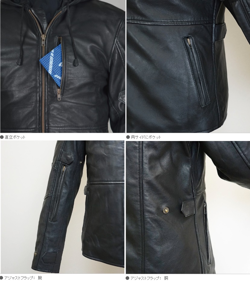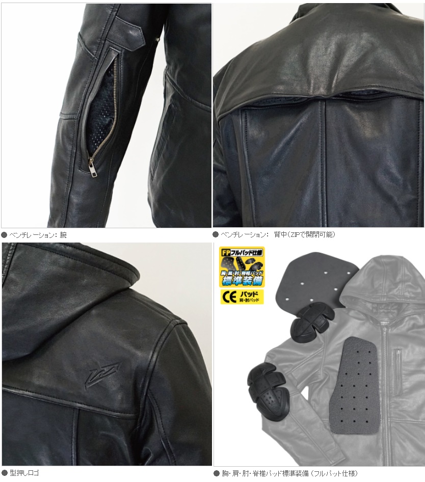 シープスキンはきめが細かく保湿性の高いしなやかな風合いで、カジュアルなパーカースタイルに最適な素材です。 気軽に羽織れる気楽さはデイリーユースで大活躍間違いなし。 アクシデントに備え、プロテクターは胸、肩、肘、脊椎パッドをフル装備した本格派。 開閉量調整が可能なアームベンチレーション、バックベンチレーションを装備し、着用時の温度管理が可能です。牛革に比べ軽量なのも魅力のひとつで、Lサイズでナント1,400g、パッドを込みでも1,900gと一日着っぱなしでも快適に過ごせます。 また、多様なオプションインナーをライニングできるオールシーズン対応品で、寒い時期にもフレキシブルに対応することが可能な、 見た目にそぐわぬ歴としたライディングレザーパーカーです。MATERIAL:表地/シープレザーPROTECTOR:胸・肩・肘・脊椎パッド標準装備 (フルパット仕様、肩・肘はCE規格)