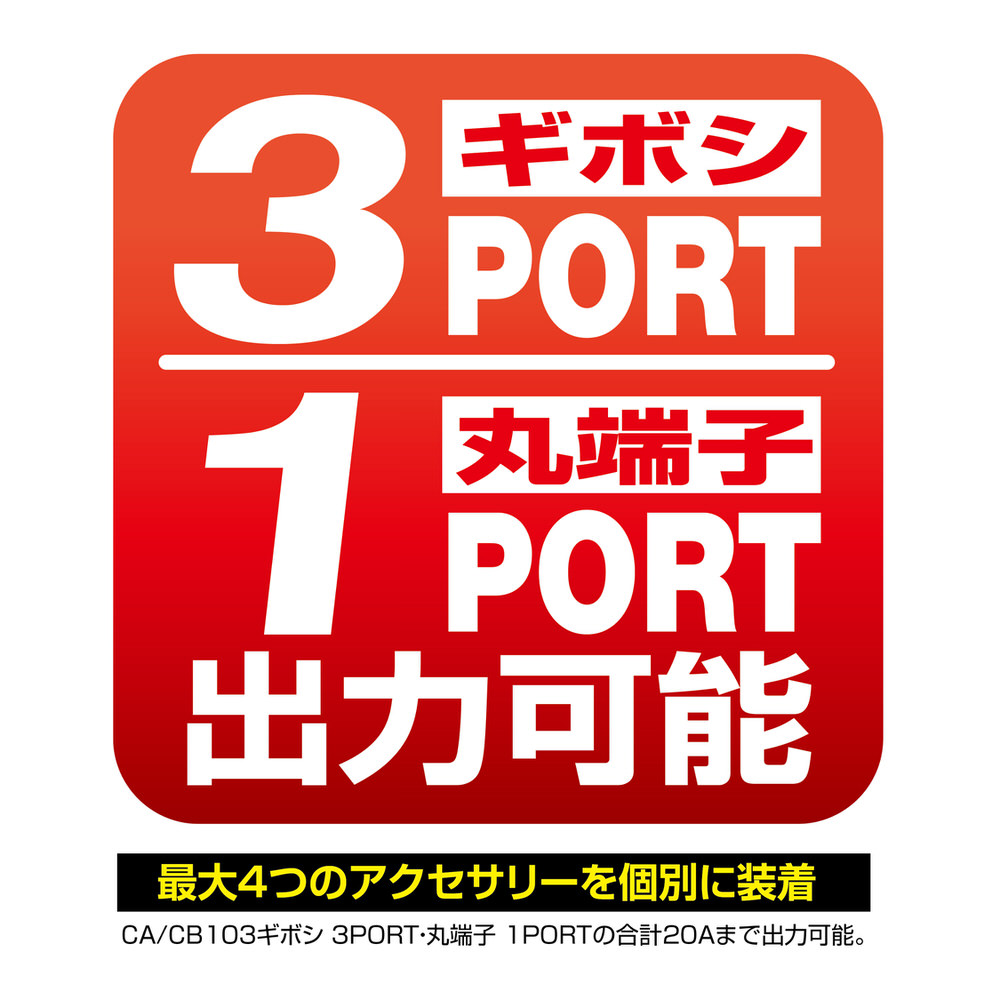最大4つのアクセサリーを個別に装着:CA/CB103ギボシ 3PORT・丸端子 1PORTの合計20Aまで出力可能。