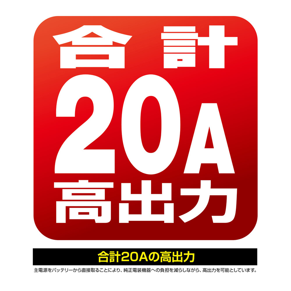 合計20Aの高出力:主電源をバッテリーから直接取ることにより、純正電装機器への負担を減らしながら、高出力を可能としています。