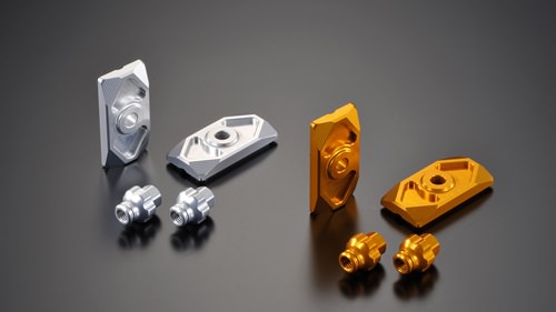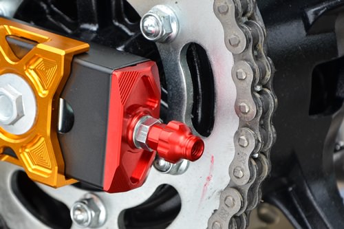 スイングアームエンド部分のチェーンアジャスターキャップを純正のスチールから交換します