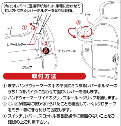 コンパクトエアロフォルムで高い取付汎用性を誇るハンドルカバー。ハンドウォーマー本体側面の穴にグリップを、手の平側に付いているレバーホルダーにレバーを差し込みます。あとは付属のマジックテープでミラーなどに固定するだけの簡単取付タイプ。