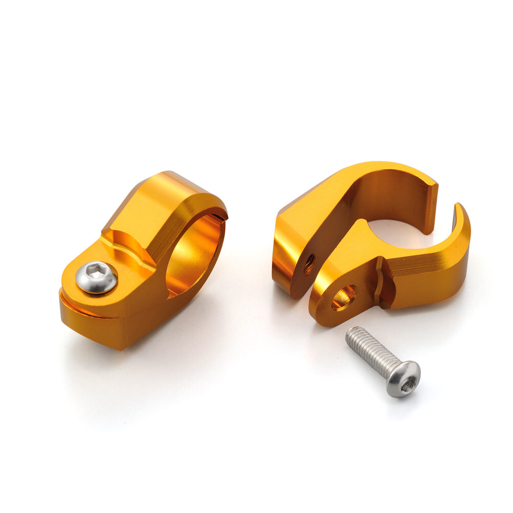 ヒンジやツメを必要としない新機構。クリアランスがせまい箇所への取り付けを考慮し、ハンドルクランプ部の肉厚を極限まで薄く設計しました。・φ22.2ハンドル用・2個入り ・ボタンボルト(M6×20)で固定。※インチバーやテーパーバーには取り付けできません。