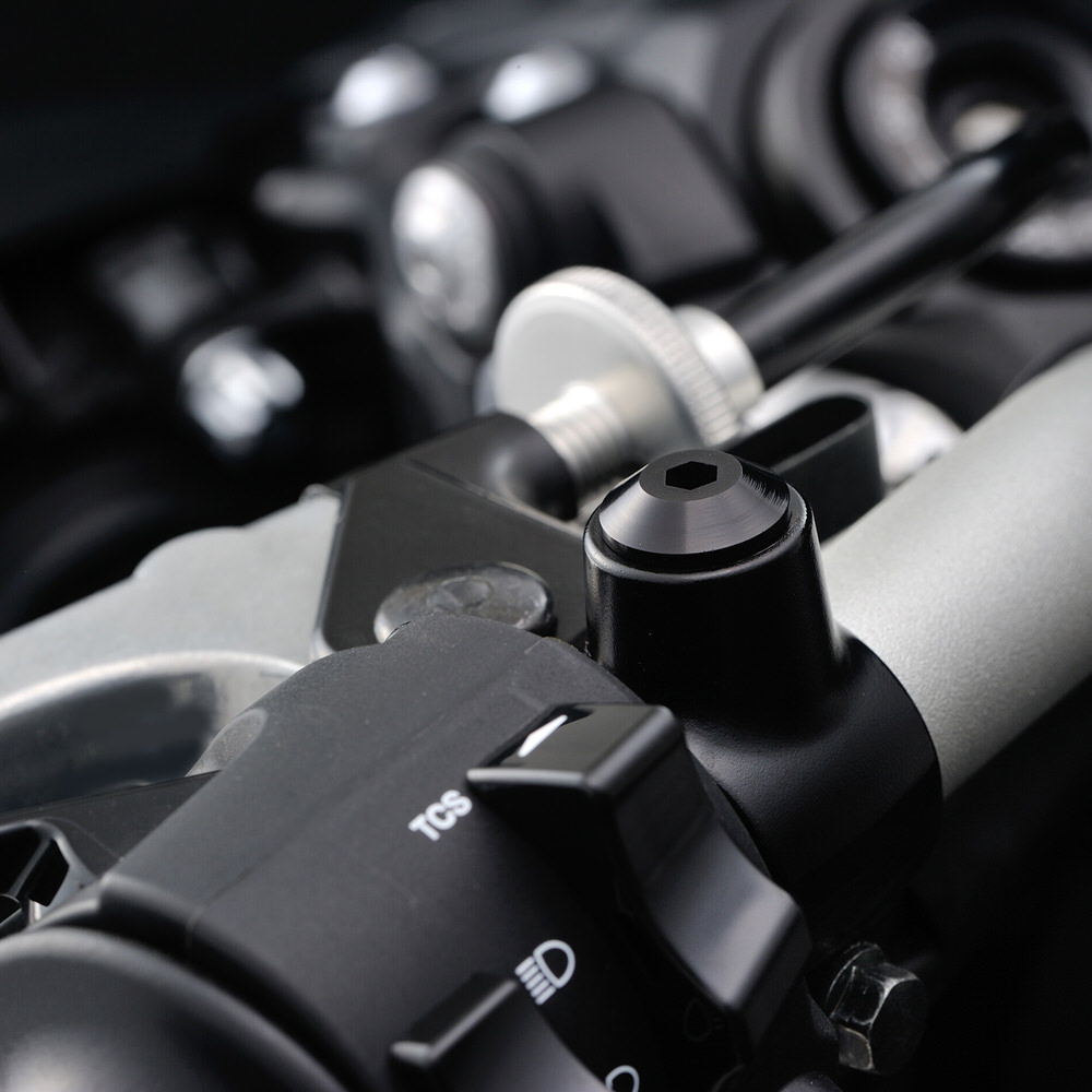 バーエンドミラー等に交換した際、純正ミラー取付穴を埋めるキャップボルト。1個売り。アルミ削り出しアルマイト仕上げ。正ネジ対応。4mmの6角レンチで取付けます。・サイズ:M10×P1. 25、外径:15mm、首下:11mm・材質:アルミ削り出し/アルマイト仕上げ