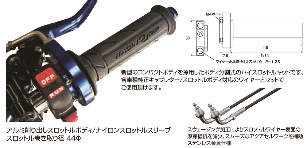 仕様スロットルボディカラー:ブルー新型のコンパクトボディを採用したボディ分割式のハイスロットルキットです。各車種純正キャブレター/スロットルボディ対応のワイヤーとセットでご使用頂けます。スウェージング加工によりスロットルワイヤー表面の摩擦抵抗を減少、スムーズなアクアセルワークを補助ステンレス金具仕様アルミ削り出しスロットルボディ/ナイロンスロットルスリーブスロットル巻き取り径44Φ