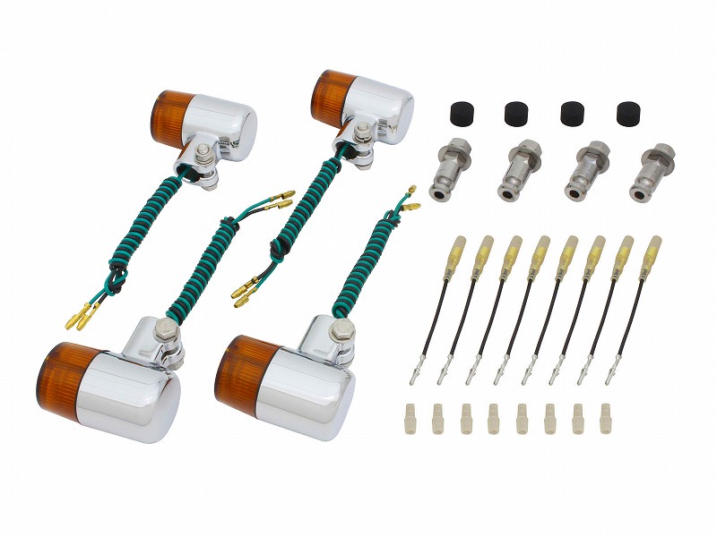 一台分に必要なパーツを全てパッケージングしました。付属電球:フロント(S球)12v15w・リア(S球)12v15w※専用変換コード付き。キット内容ウインカー本体S球x4個M10ウインカーステーメッキx4本M10X40スタッドボルトx4本M10ナット/ワッシャー/Sワッシャー各4個防水スポンジx4個カワサキ変換コードx8本ウインカー本体:アルミダイキャスト製