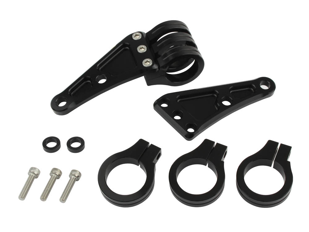 アルミ削り出し、アルマイト仕上げ。フォーククランプの取り付けにはトップブリッジを取り外す必要があります。クランプの位置によってはタンクと干渉する場合がありますので注意ください。