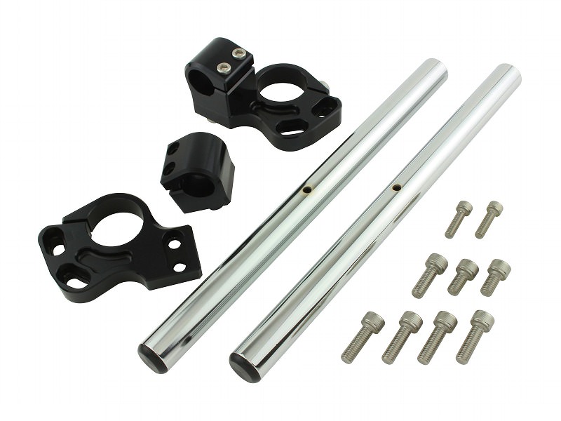 トップブリッジからフロントフォークを10〜15mm程度突出して取付け。フロントフォークにクランプするためハンドル剛性も向上します。絞り角調整が可能です。ABS車はブレーキホースの交換ができないため調整が限られます。スチール製ハンドルバー全長300mm使用。穴あけ加工済み。バーエンドは付属しておりません。POSH社マシンドトップブリッジ使用の場合は5cmロングのブレーキホースへの変更をおすすめします。
