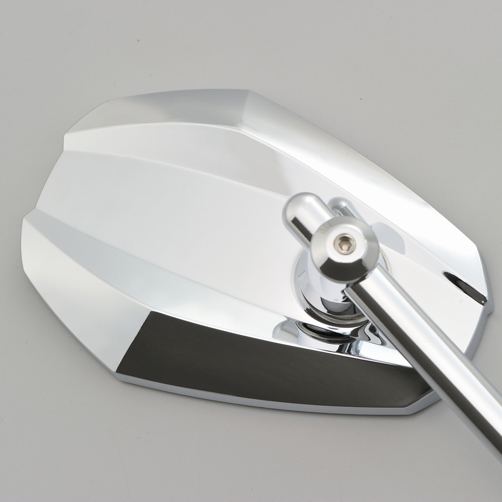 耐震・広角仕様のハイビジミラー。直径12mmの極太ロッド採用鏡するとともに、鏡の取付強度を上げることで耐震性を向上。振動の多いバイクでもミラーがぶれにくい。鏡は曲率R1000の広角仕様ので、後方の死角を減少。EDGEは個性的な鋭利なスタイルで、車体のLOWフォルムを意識した低めのロッドを採用。・鏡面:クリアーミラー・左右共通