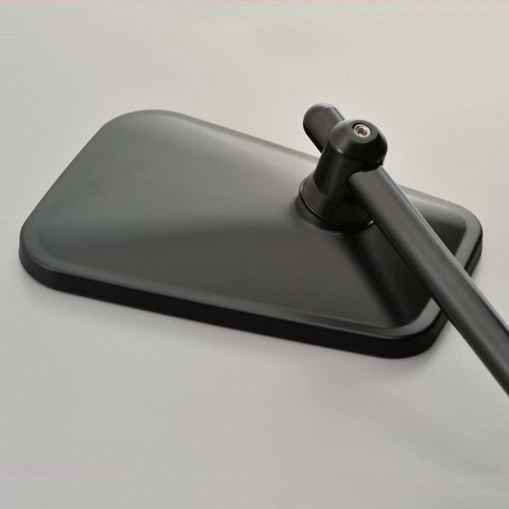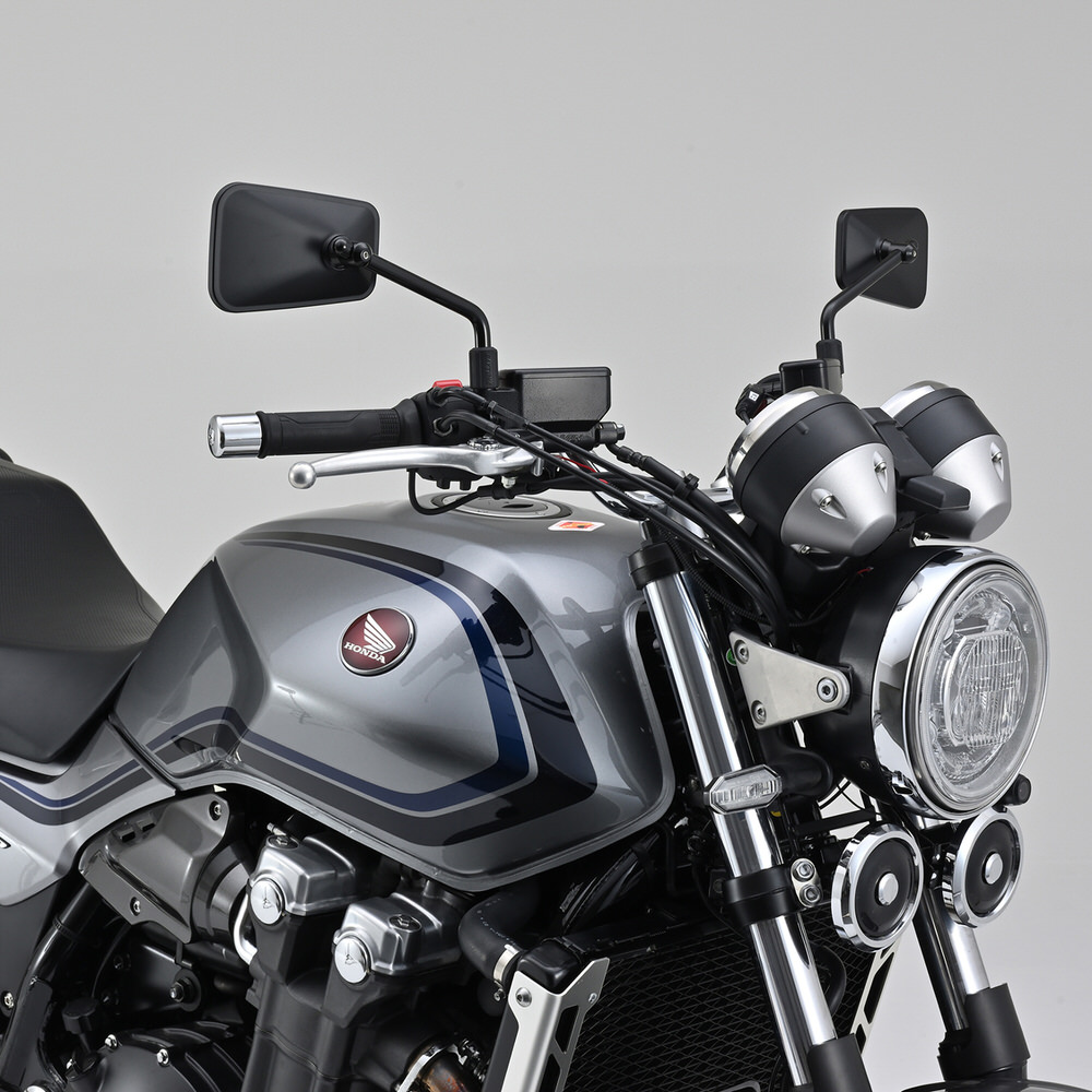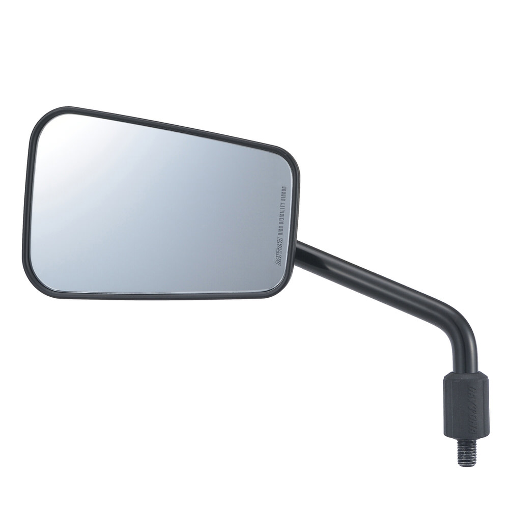 耐震・広角仕様のハイビジミラー。直径12mmの極太ロッド採用鏡するとともに、鏡の取付強度を上げることで耐震性を向上。振動の多いバイクでもミラーがぶれにくい。鏡は曲率R1001の広角仕様ので、後方の死角を減少。クラシックなスクエア形状で、車体のLOWフォルムを意識した低めのロッドを採用。・鏡面:クリアーミラー・左右共通