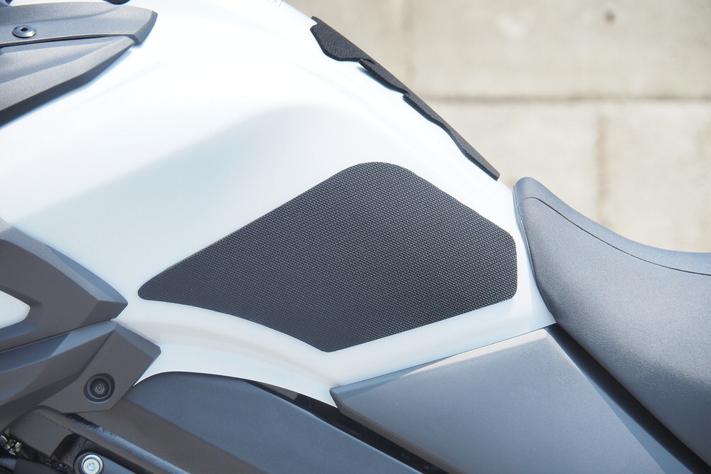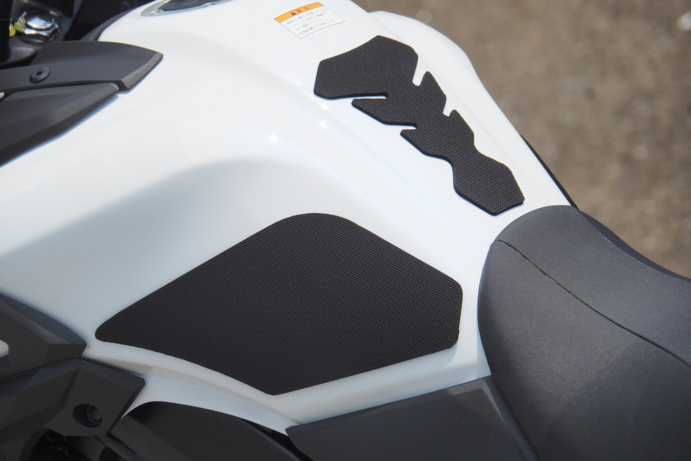 カラー:ブラック素材:中硬度EPDM系ゴム厚さ:3mm表面形状:ノンスリップ(スクエアブロック)【ポイント1.車体との一体感】本商品はすべて車種別専用設計です。車種毎に実写から図面を起こしているため、貼り付けた際の一体感に優れます。また製造を日本国内で行うことにもこだわりました。諸外国と比較してもゴム製品の品質において日本はトップクラスだからです。その中でも豊富な経験とノウハウを持つ老舗メーカーに製造を依頼しました。【ポイント2.ノンスリップ形状】滑り止め効果を発揮する連続した凹凸面。グリップ力が向上すると共に適度な硬さはホールド時の負担を軽減させます。引き裂き強度にも優れた素材です。【ポイント3.タンクを傷からガード】大切に扱っていても気づくとついているタンクの傷。上着・ズボンの金具による擦れや、洗車、バイクカバーの脱着でもその傷は増えていきます。本商品は日常的な使用によってついてしまう傷からボディを保護します。【ポイント4.優れた粘着面】タンクパッド裏の両面テープにはカッティングシートでも有名なTOYO-CHEMが開発に携わった新素材を使用しています。特殊粘着剤を使用することで経時変化による粘着性能の低下を抑えると同時に、粘着剤の間にPET素材を挟むことで水分の浸透を防ぐという特徴があります。【ポイント5.屋外使用に適した素材】中硬度ゴムの一般特性と仕様です。各種試験項目をクリアしているのはもちろんのこと、季節天候問わず使用する上で重要な耐候性、耐オゾン性にも優れます。
