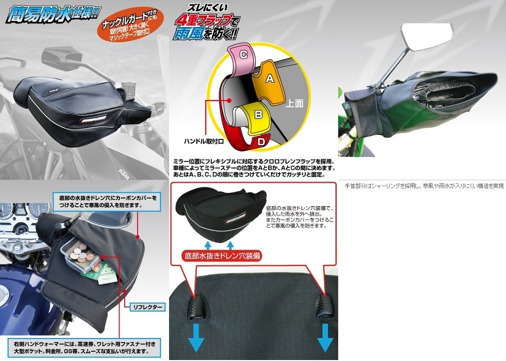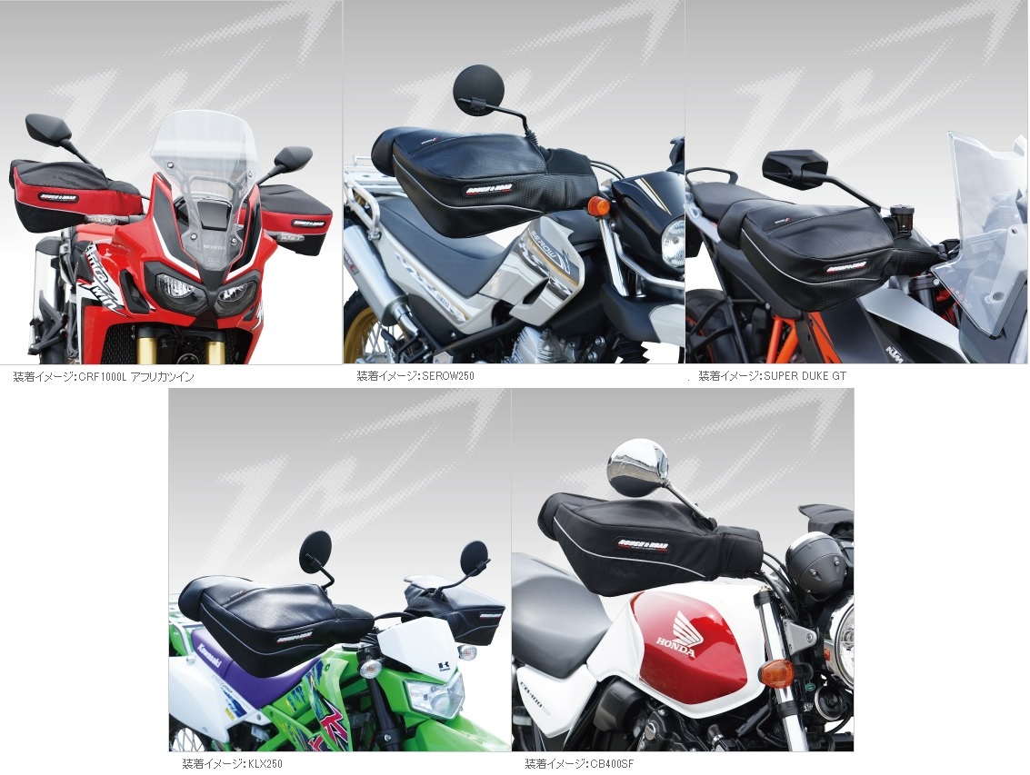 ハンドガード付のオフ車からネイキッド、ビッグスクーターまで※1幅広く対応するハンドウォーマー。装着時にも抜群の操作性を実現し、カラーバリエーションも全6色をラインナップ。愛車に合わせてコーディネートしやすくなっています。裏地部分には防水フィルムを入れ、入り口部分にシャーリングを設けることで雨水の浸入を抑えた簡易防水仕様となっています。※1 車両タイプ、ハンドガードの大きさによってはつかないことがあります。MATERIAL:バリアクロス600D、バリスターナイロンクロス、PVC、PVCタフタ、圧縮ウレタン、クロロプレン※商品を装着した場合、一部ビッグスクーターのパーキングレバーが使いにくいことがあります※グリップの外径が太いもの、特殊な形状のものはハンドルカバーを装着すると、操作上不具合が出る場合があります。その場合は安全のため、ハンドルカバーの使用を中止してください。※車両タイプ、ハンドガードの大きさによってはつかないことがあります。
