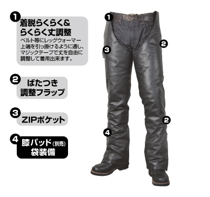 固定はベルト吊り下げ式でサイドファスナーはフルオープンが可能なので、ブーツを履いたまま脱ぎ履き可能な防護兼防寒チャップスです。表皮は牛革で高いプロテクション性をもち、裏側にはキルティング綿を採用してあり冬季での使用に最適。通勤通学からツーリングまで幅広く使える多才な用途を備えた新感覚防寒着です。携帯に便利な収納袋付き。また、膝裏にあるパッド袋に別売のパッドを入れる事で安全性を確保することが出来ます。SIZE:LONG(身長165〜185cm)MATERIAL:表地/牛革 裏地/タフタキルト 中綿/ウォームマックス収納袋付き(収納時:約28×35×8cm)膝パッド袋装備(パッドはオプション)