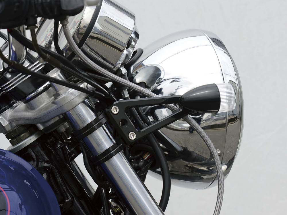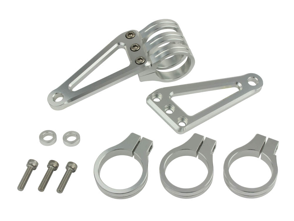 サークルクランプタイプ Φ39mmアルミ削り出し、アルマイト仕上げ、ステンレスボルト使用※フォーククランプの取り付けにはトップブリッジを取り外す必要があります。車体によっては別途アルミカラー等により調整が必要な場合があります。※クランプの位置によってはタンクと干渉する場合がありますのでご注意ください。ウインカーを共締めする場合はロングボルトへ交換が必要です。