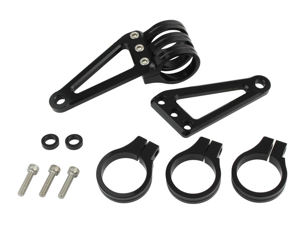 サークルクランプタイプ Φ39mmアルミ削り出し、アルマイト仕上げ、ステンレスボルト使用※フォーククランプの取り付けにはトップブリッジを取り外す必要があります。車体によっては別途アルミカラー等により調整が必要な場合があります。※クランプの位置によってはタンクと干渉する場合がありますのでご注意ください。ウインカーを共締めする場合はロングボルトへ交換が必要です。