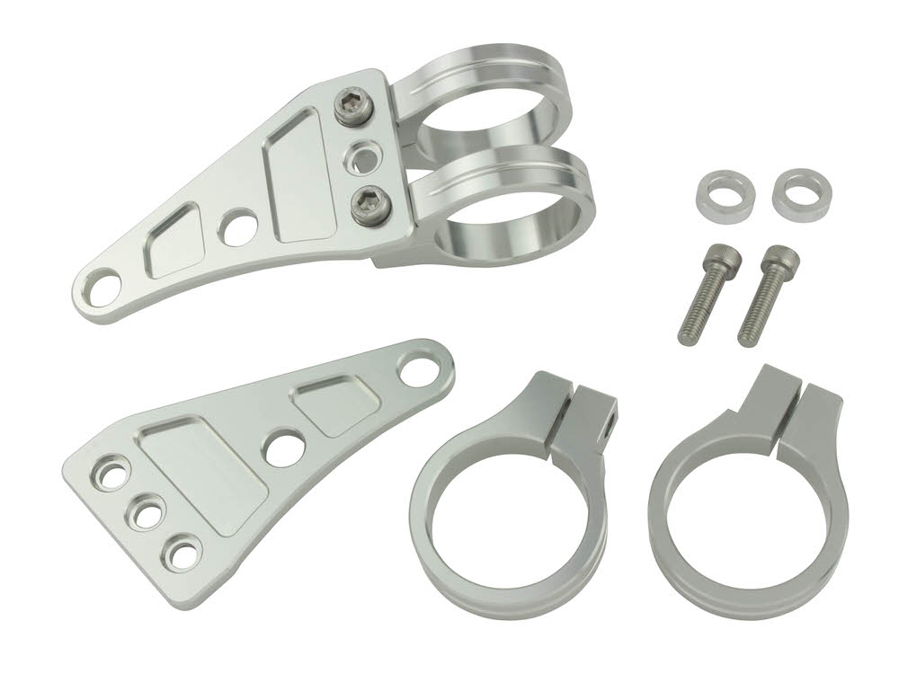 2サークルクランプタイプ Φ39mmアルミ削り出し、アルマイト仕上げ、ステンレスボルト使用※フォーククランプの取り付けにはトップブリッジを取り外す必要があります。※クランプの位置によってはタンクと干渉する場合がありますのでご注意ください。