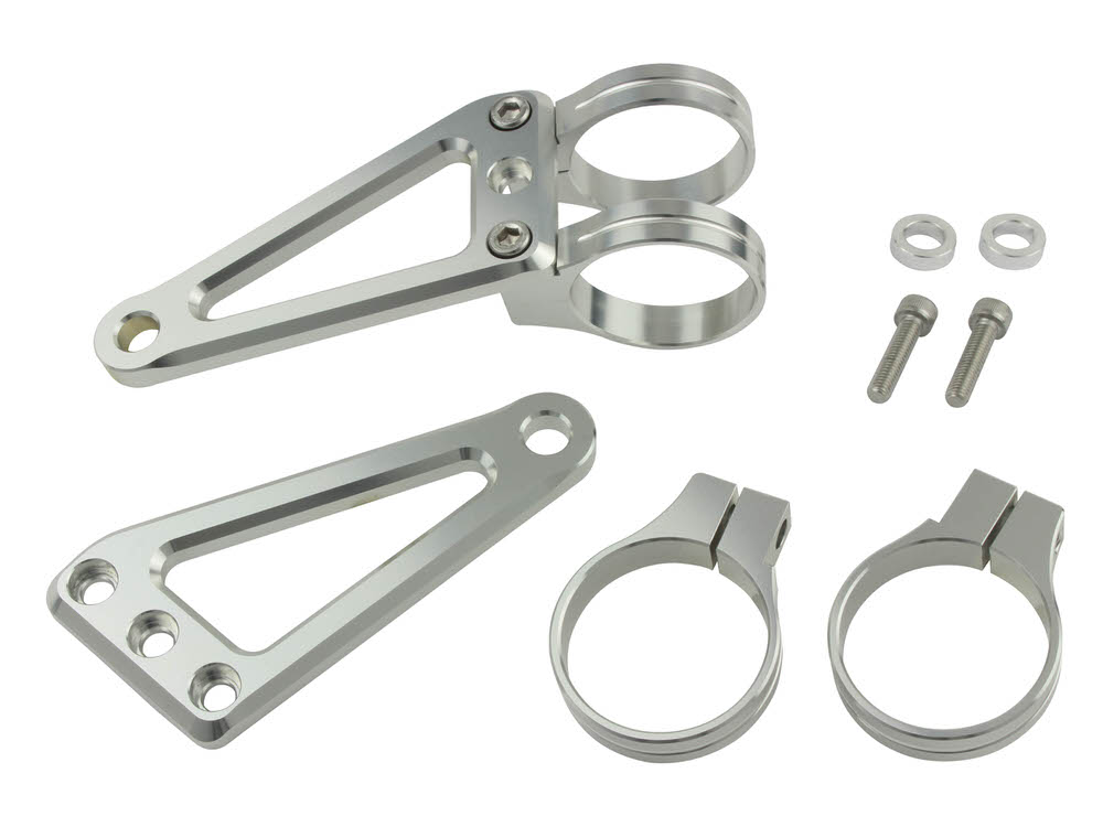 サークルクランプタイプ Φ43mmアルミ削り出し、アルマイト仕上げ、ステンレスボルト使用※フォーククランプの取り付けにはトップブリッジを取り外す必要があります。車体によっては別途アルミカラー等により調整が必要な場合があります。※クランプの位置によってはタンクと干渉する場合がありますのでご注意ください。ウインカーを共締めする場合はロングボルトへ交換が必要です。