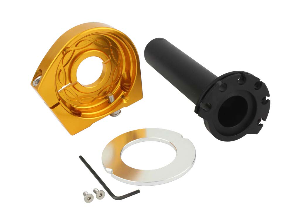 従来のスリムラインハイスロットルキットを更に改良したスムーススリムラインハイスロットルキット1.スムースな動きが可能な樹脂製スリーブ2.スロットルハウジング内にはグリスキャッチャーを設け、メンテナンス効率を改良3.スロットルホルダー部は、厚さ14mmアルミ削り出し4.スロットルケーブルナットはステンレス製※ノーマルスイッチ類使用可能。※グリップは付属しておりません。