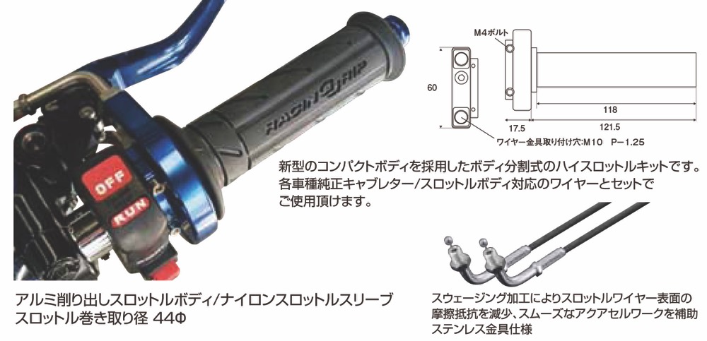 従来のスリムラインハイスロットルキットを更に改良したスムーススリムラインハイスロットルキット1.スムースな動きが可能な樹脂製スリーブ2.スロットルハウジング内にはグリスキャッチャーを設け、メンテナンス効率を改良3.スロットルホルダー部は、厚さ14mmアルミ削り出し4.スロットルケーブルナットはステンレス製※ノーマルスイッチ類使用可能。※グリップは付属しておりません。