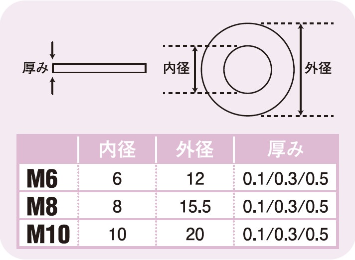 ステンレス製カスタムパーツのフィッティングの際に必要になる細かい寸法調整にお使いください。M8サイズ/厚み0.3mm 2個入り
