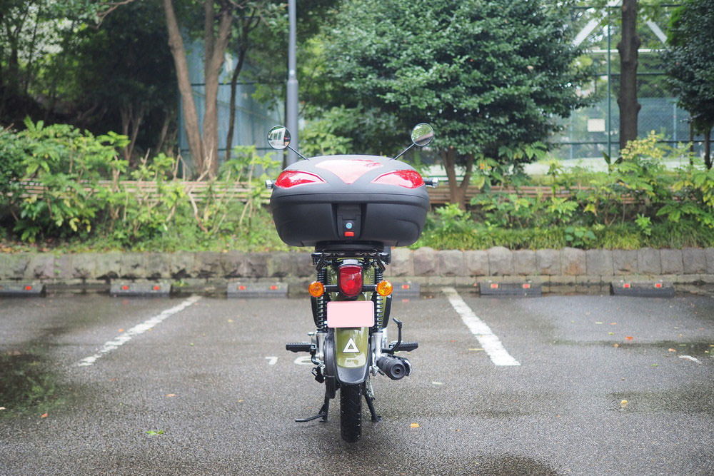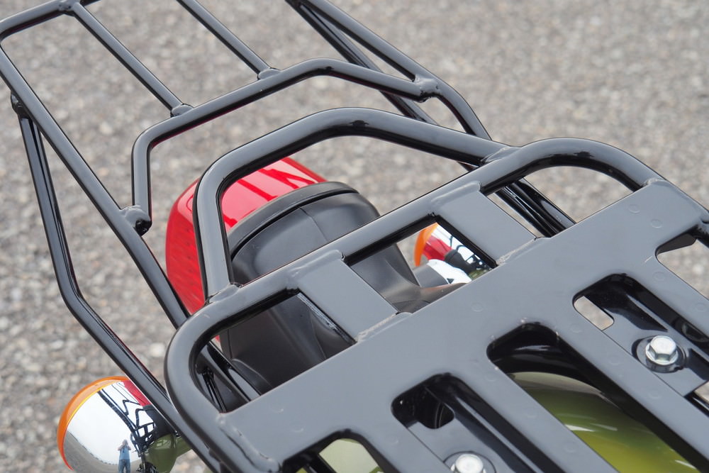 素材:スチールカラー:ブラックウレタン塗装仕上げ純正キャリア共用タイプ耐荷重:5kgリアボックス容量:43L1.天板の高さは純正とほぼ同じ長い物を積載できるように天板の高さは純正にあわせました。やや後ろ上がりなのはリアボックスを装着した際に開閉した蓋が勝手にしまらないようにするためです。2.純正キャリアの機能性は損ねません。純正キャリアはセンタースタンドを立てる際に掴みやすく設計されているため、手を入れるスペースをしっかりと確保しました。3.天板サイズは215mm×180mm天板の横サイズを純正キャリアに合わせて設計する事も検討しましたが、キャリア自体の重量が重くなり耐荷重に悪影響がでるためコンパクトに設計しました。4.耐荷重は5kg天板を支える支柱部分には補強を入れ耐荷重は5kg。大型のリアボックスも装着する事が可能です。5.リアボックスベースを装着しやすい天板デザインワールドウォーク製はもちろん、GIVIやクーケースなどのリアボックスベースを装着しやすい天板レイアウトにしました。