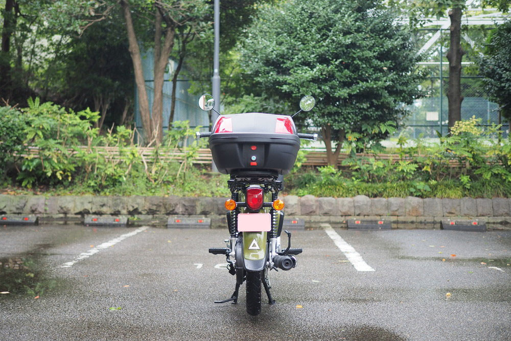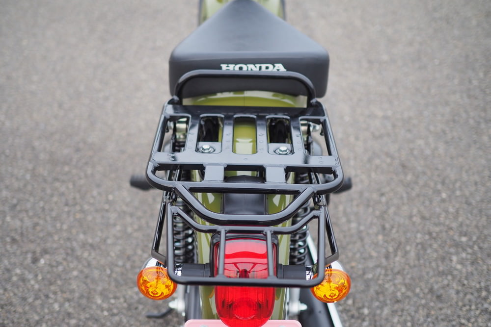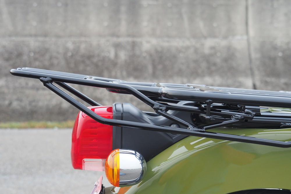 素材:スチールカラー:ブラックウレタン塗装仕上げ純正キャリア共用タイプ耐荷重:5kgリアボックス容量:32L1.天板の高さは純正とほぼ同じ長い物を積載できるように天板の高さは純正にあわせました。やや後ろ上がりなのはリアボックスを装着した際に開閉した蓋が勝手にしまらないようにするためです。2.純正キャリアの機能性は損ねません。純正キャリアはセンタースタンドを立てる際に掴みやすく設計されているため、手を入れるスペースをしっかりと確保しました。3.天板サイズは215mm×180mm天板の横サイズを純正キャリアに合わせて設計する事も検討しましたが、キャリア自体の重量が重くなり耐荷重に悪影響がでるためコンパクトに設計しました。4.耐荷重は5kg天板を支える支柱部分には補強を入れ耐荷重は5kg。大型のリアボックスも装着する事が可能です。5.リアボックスベースを装着しやすい天板デザインワールドウォーク製はもちろん、GIVIやクーケースなどのリアボックスベースを装着しやすい天板レイアウトにしました。