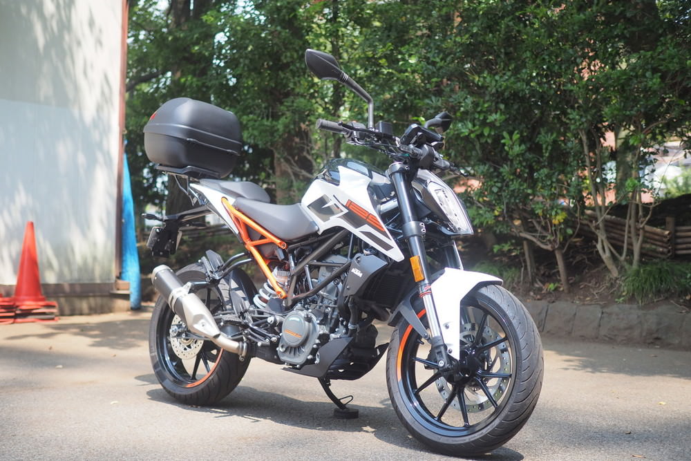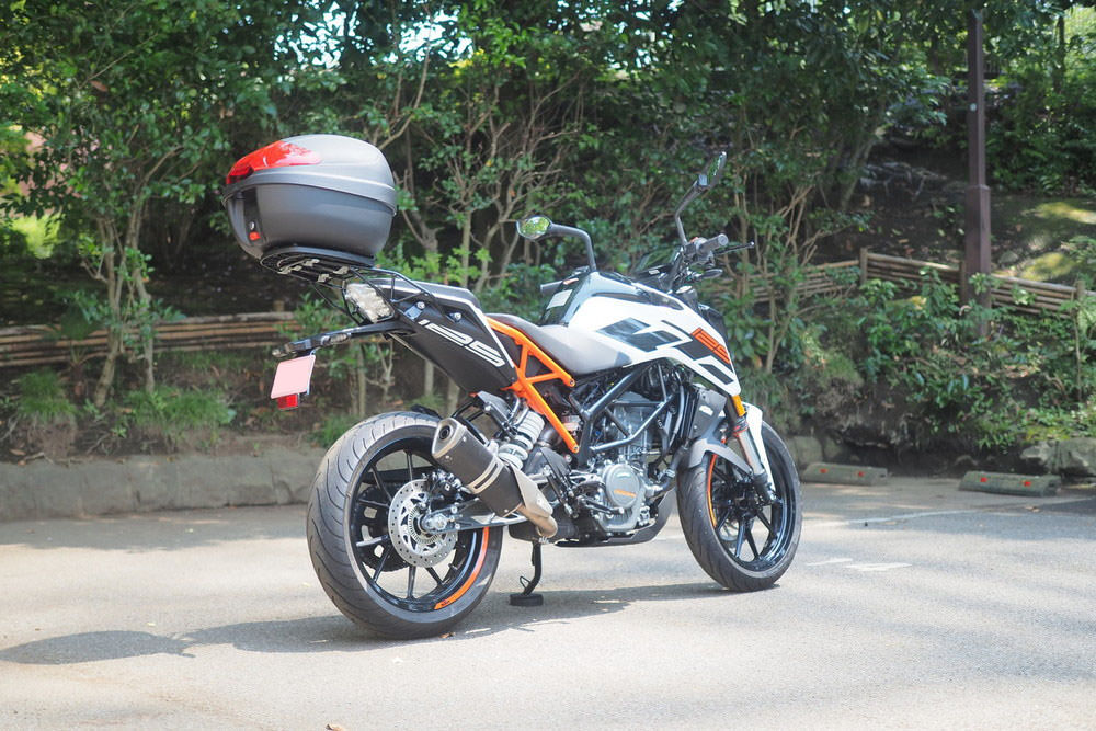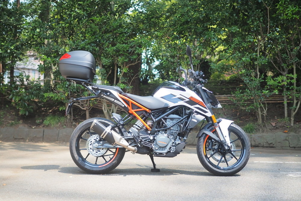 リアボックス容量:30L1.天板の高さはタンデムシートと大体同じ長い物を積載できるように天板の高さは純正にあわせました。やや後ろ上がりなのはリアボックスを装着した際に開閉した蓋が勝手にしまらないようにするためです。2.純正のシャープなデザインを崩しません天板を支える足はカウルに沿うようにし、天板は後ろ側を狭めたシャープなデザインを採用する事で車両のイメージを崩しません3.天板サイズは250mm×240mm後ろに向けて急激に細くなるDUKEのテールデザインにあわせて天板は幅の広い部分と狭い部分で大きくサイズ感が異なります4.耐荷重は5kg天板を支える支柱部分には補強を入れ耐荷重は5kg。大型のリアボックスも装着する事が可能です5.取り付けボルトはステンレスリアキャリアを装着する為のボルトは錆びにくいステンレスを採用しました。