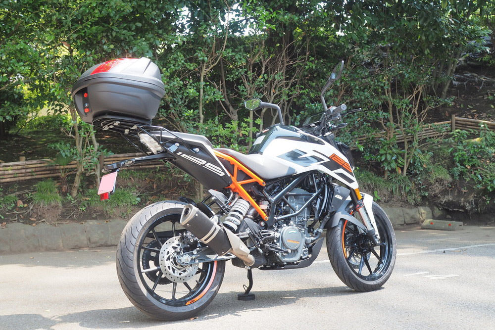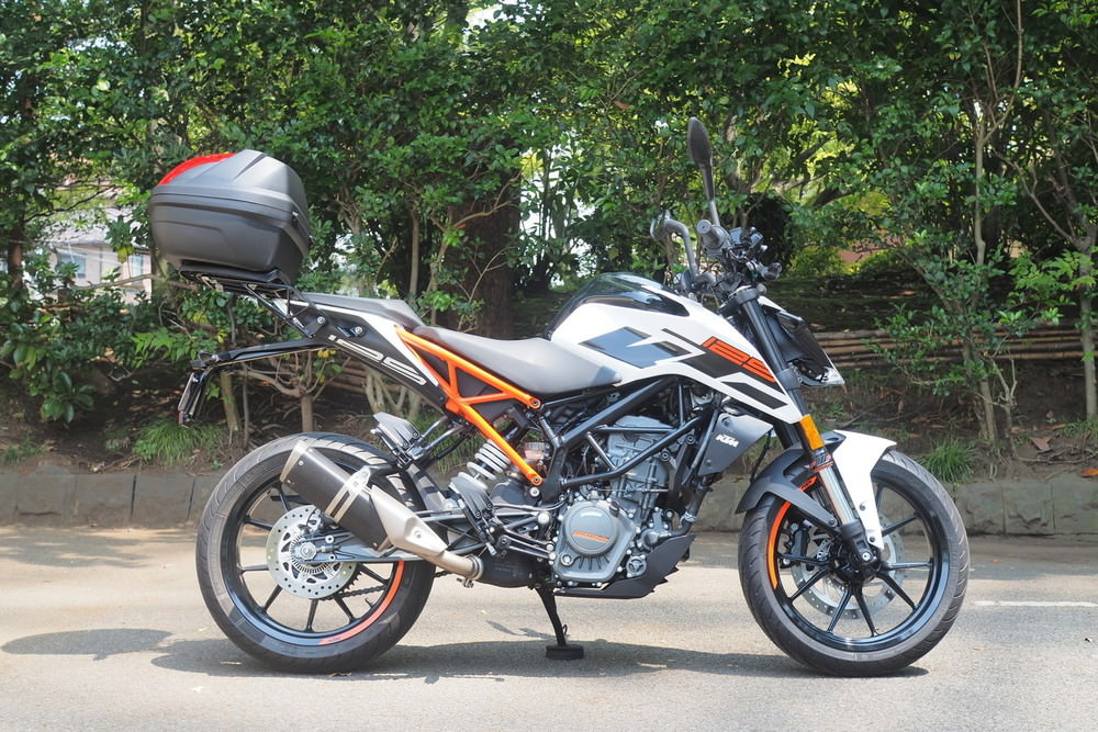 リアボックス容量:32L1.天板の高さはタンデムシートと大体同じ長い物を積載できるように天板の高さは純正にあわせました。やや後ろ上がりなのはリアボックスを装着した際に開閉した蓋が勝手にしまらないようにするためです。2.純正のシャープなデザインを崩しません天板を支える足はカウルに沿うようにし、天板は後ろ側を狭めたシャープなデザインを採用する事で車両のイメージを崩しません3.天板サイズは250mm×240mm後ろに向けて急激に細くなるDUKEのテールデザインにあわせて天板は幅の広い部分と狭い部分で大きくサイズ感が異なります4.耐荷重は5kg天板を支える支柱部分には補強を入れ耐荷重は5kg。大型のリアボックスも装着する事が可能です5.取り付けボルトはステンレスリアキャリアを装着する為のボルトは錆びにくいステンレスを採用しました。