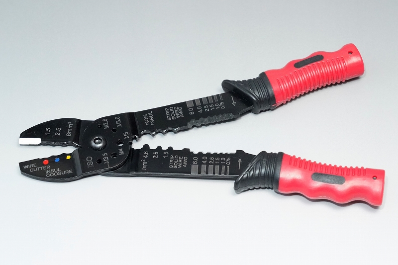圧着ペンチは各種類の端子を圧着するのがもちろん、刃部を研磨仕上げにすることで鋭い切れ味を実現して、電線の切断と電線被覆のストリップが楽にできます。ネジなどを切断する穴はいつく付いて、多種類の小ネジ・ボルトの切断も可能です。ロックデバイス(取り外し可能)は、圧着ペンチの精度と密封作業を保証でき、作業の安全も高めます。圧着ペンチとともに、絶縁端子は赤・青・黄の3種類があるので、ペンチの赤・青・黄の位置に合わせて圧着します。この圧着ペンチがあれば、ガレージ、機械工場、作業場などの場所で簡単に作業できます。自動車、PCなどあらゆる場面での配線作業や家庭のソケットやコンセントの補修・配線に適しています。【製品詳細】本体全長 220mm本体重量 260g機能電線ストリッパー 0.75〜6sq裸端子端子圧着 1.5〜6.0sqファストン端子圧着 1.5〜6.0sqネジカット M2.6〜M5一般電線カッター