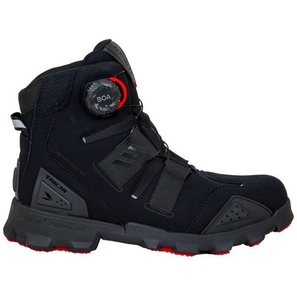 アドベンチャーコンセプトのデザインに基づき、悪路でのグリップに優れたTAICHIオリジナル成型ソールを採用したシューズ。アッパーのカラーに合わせてソールにも3タイプのカラーを設定しております。防水と透湿機能を兼ね備えたDRYMASTERをインサートし、悪天候にも快適な履き心地を実現。着脱に便利なBOAダイヤルは大型のM4タイプを新採用し、グローブを装着したままでもロックとリリースの操作を容易に。スェード設定のSUEDE BLACKとSUEDE BROWNの左足にはアクセサリーとして引手をつけております。□第4世代(M4)BOAレーシングシステム□硬質成形プロテクター(ヒール)□オリジナルデザインビブラムソール