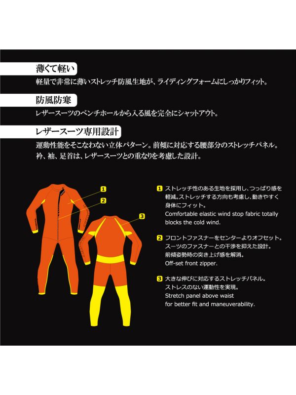 薄くて軽いストレッチ防風生地がライディング時にフィット 高い運動性能と防風を兼ね揃えたレーシングスーツ専用のインナー