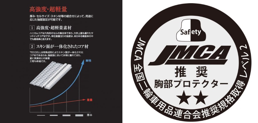 水よりも比重の軽いポリプロピレン樹脂を使用し、特殊成形技術によって構成されたハニカムコア構造を採用することによりCE level2をクリアした製品の中では世界最軽量を実現。また、単一素材形成なのでプロテクター全体で高い衝撃吸収性を発揮します。TAICHIジャケットのCPS(チェストプロテクターシステム)はもちろん、他社製のジャケットでも、プロテクター装着用のボタンシステムがあれば簡単に装着することが可能です。ボタンシステムがない場合は TRV064(ベルトタイプ) を購入することで身体に装着することもできます。 深刻なダメージにつながりやすい胸部を守りつつ、軽量化も併せ持ったTECCELチェストプロテクターで、万一に備えた快適なツーリングを楽しみましょう。サイズ:高さ220x幅250x厚さ17mm(8.5mmx2層)重量:230g