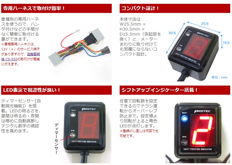 ●専用ハーネスで取付け簡単。車種別の専用ハーネスを使うので、ハンダ付けなどの手間がなく簡単に取付ける事ができます。●コンパクト設計。本体寸法はW25.5mm×H30.5mm×D15.5mm(突起部を除く)と、メーターまわりに取り付けても邪魔にならないコンパクト設計。●LED表示で視認性が良い。ディマーセンサー(自動調光機能)を搭載。LEDの明るさを、昼間は明るめ・夜間は暗めに自動調節しデジタル数字の視認性を高めます。●シフトアップインジケーター搭載。任意で回転数を設定できるのでナラシ運転からオーバーレブ防止まで。設定値より回転が上ると青色LEDが点灯します。※登録のし直しは何回でも可能です。【本体】・定格電圧:DC12V・外径寸法:W25.5mm×H30.5mm×D15.5mm※突起部を除く【構成部品】・SPI-110 C1本体×1・車種専用ハーネス×1・各種両面テープ・取扱説明書、保証書※走行中クラッチを握ると入っているギア以外の表示が出ますが、故障ではありません。※抵抗無スパークプラグのご使用はおやめください。抵抗無プラグを使用するとノイズが発生し回転信号が正しく入力されない場合がありますので抵抗入りスパークプラグをご使用ください。