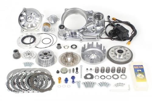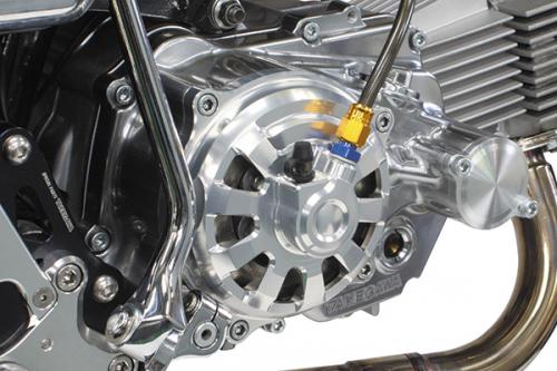 レリーズピストン径を拡大し、ベンチレーションホールを数多く配置したアルミ削り出しクラッチカバー採用ハイスペックエンジンに対応する乾式クラッチキット TYPE-R回転マス重量を軽減しつつ、6ディスク化によりクラッチ容量アップを実現しました。製品スペック油圧式乾式クラッチTYPE-R 6ディスク(標準仕様) ※スリッパークラッチ機構はありません。油圧式乾式クラッチキットマスターシリンダー付属右クランクケースカバー、クラッチカバー詳細兼用の右クランクケースカバーを採用右クランクケースカバーにはアルミダイカスト製を採用。カバー表面はバフ研磨後、クリア塗装が施されています。湿式クラッチ、乾式クラッチのどちらにも使用出来る右クランクケースカバー形状を採用。乾式クラッチ購入後もスペシャルクラッチ(湿式)へ仕様変更出来ます。※仕様変更はSP武川社指定パーツの別途購入が必要です。アルミ削り出しクラッチカバー(油圧式)カバーはアルミ削り出しクリアアルマイト仕上げブリーダーバルブ部とホースフィッティング装着部に新形状を採用し、冷却効果を高めるベンチレーションホールを複数配置しています。更にクラッチ操作の向上を図る為、レリーズピストン径を従来品Φ29.5からΦ33に拡大し、クラッチレバーの操作を軽くしています。オプショナルパーツ・乾式クラッチ特有の騒音を緩和する防音ラバーキャップの装着が可能。オイルエレメント内蔵オイル内にあるスラッジや金属摩耗粉などの不純物をろ過します。オイル内の不純物を除去することで、エンジン出力の維持が可能になります。オイルエレメントは信頼性の高い、カートリッジ式ペーパータイプを採用。オイルレベル確認窓付きオイル量の確認が行えます。エンジンオイル確認窓には耐久性のあるガラスを採用。大型オイルフィラーキャップを採用アルミダイカスト製クロムメッキ仕上げ注油口を大きくすることでオイル交換が容易に行えます。6ディスク強化クラッチ詳細クラッチユニットの変更ノーマルクランクシャフト(1次側)からミッションのメインシャフト(2次側)に変更することで、クランクシャフトの負担を軽減すると共にクランクシャフト軸の軽量化が可能になり軽やかなスロットルレスポンスを発揮します。6ディスク仕様従来品に比べダウンサイジングを図り、回転マス重量を約12%軽減。ケブラー配合フリクションディスクを5枚、ジャダーの軽減を図る専用フリクションディスクを1枚採用し、6ディスク化を実現。これにより、クラッチの容量が従来品に比べ約20%アップし、ハイパワーエンジンに対応します。標準クラッチ仕様(スリッパークラッチ無し)プライマリードリブンギアクラッチ接続時にギア等のショック軽減を図るラバーダンパーを内蔵。リフタープレート標準仕様はアルミ削り出しリフタープレートを採用。クラッチスプリング耐疲労性に優れ、安定したクラッチフィールを実現。オプショナルパーツオイルクーラーユニットオイルクーラーユニットをオイルエレメント部に装着することで、オイルクーラーへのオイル取出しが行えます。SP武川社ではオイルクーラーユニット付きのオイルクーラーキットがあります。SP武川社WEBカタログをご覧下さい。インラインサーモユニットオイルラインにSP武川社製インラインサーモユニットを装着することで、オーバークールの防止が可能になります。注意事項SP武川社製乾式クラッチ用5・6速クロスミッションの同時装着が必要になります。WEBカタログ参照。又、モンキー キャブレター車とインジェクション車ではクロスミッションキットの品番が異なります。ノーマルマフラー、アップタイプマフラーの同時装着は出来ません。