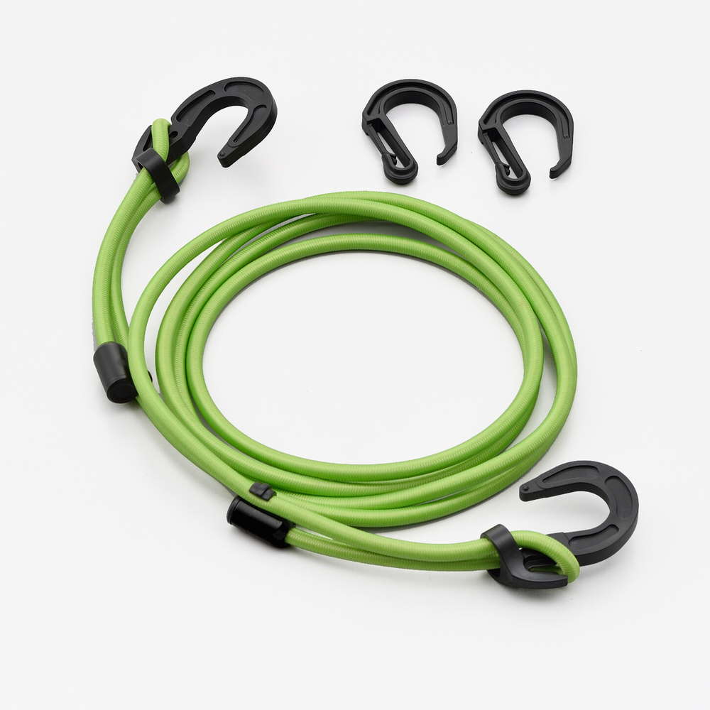長さ調整式フック採用。荷物の量に合わせてコードの長さが調節可能。シンプルな調節機構で荷物の押さえ加減調整も簡単。ミニフック付きのコードエンド採用で、余ったコードもスマートに処理できます。・中間フック2個付き仕様:2500mm ライムグリーン