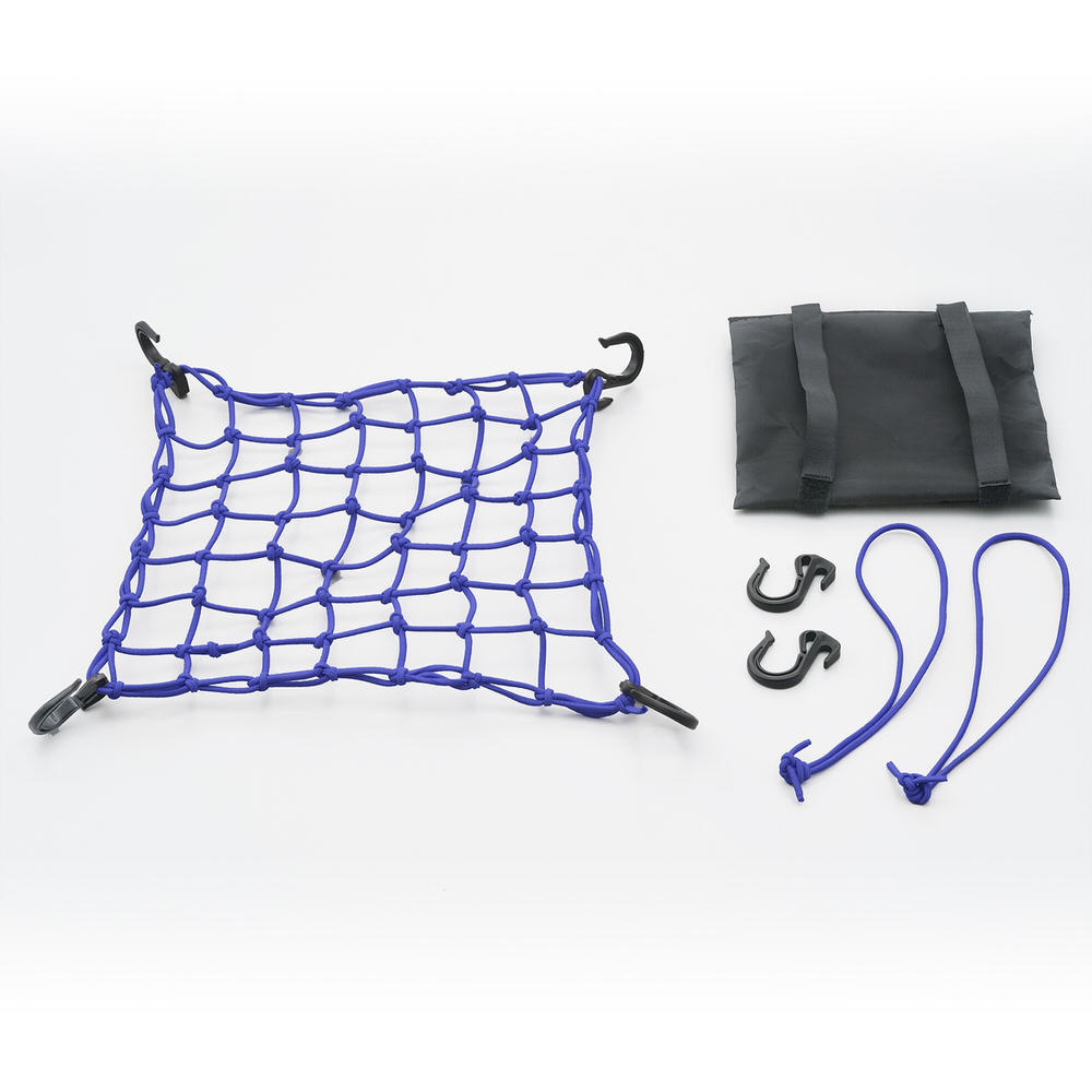 使いやすいコンパクトなフック(6個付):変形や摩耗が少ない強化プラスチックを使用し、H型断面構造で強度のあるコンパクトフック。コンパクトだから使い勝手も良く、ネットをたぐり、サイズ調整も可能な設計です。小さなマス目&サブコード付:約45mmのマス目で荷こぼれしにくく、実用性を考慮した4.0mmゴムで程よい伸び具合と締め付け具合。マス目にむだの出ない、サブコード2本付。収納時に便利なポーチ付き。仕様:Mサイズ(300x300mm) ブルー