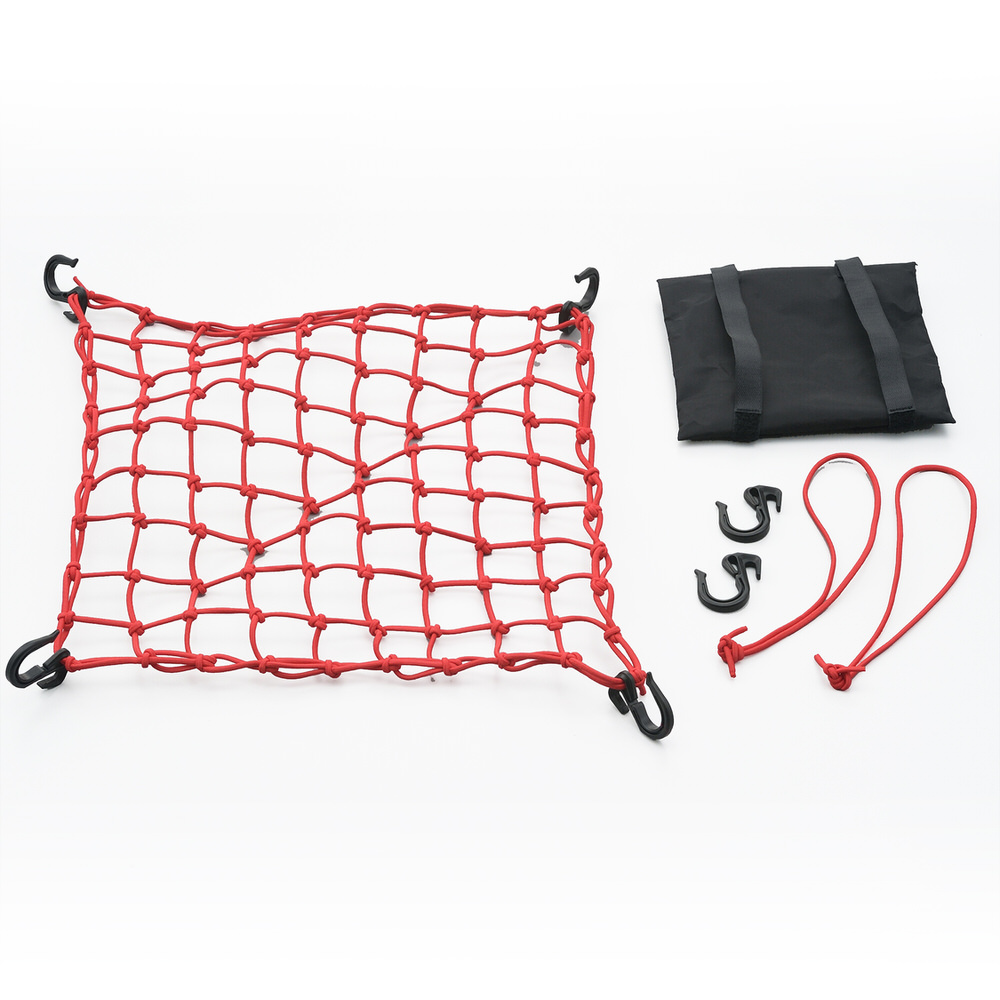 使いやすいコンパクトなフック(6個付):変形や摩耗が少ない強化プラスチックを使用し、H型断面構造で強度のあるコンパクトフック。コンパクトだから使い勝手も良く、ネットをたぐり、サイズ調整も可能な設計です。小さなマス目&サブコード付:約45mmのマス目で荷こぼれしにくく、実用性を考慮した4.0mmゴムで程よい伸び具合と締め付け具合。マス目にむだの出ない、サブコード2本付。収納時に便利なポーチ付き。仕様:Lサイズ(400x400mm) レッド