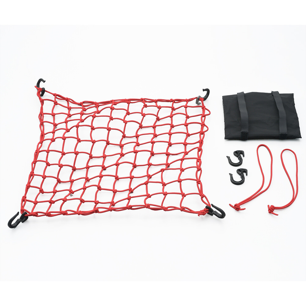 使いやすいコンパクトなフック(6個付):変形や摩耗が少ない強化プラスチックを使用し、H型断面構造で強度のあるコンパクトフック。コンパクトだから使い勝手も良く、ネットをたぐり、サイズ調整も可能な設計です。小さなマス目&サブコード付:約45mmのマス目で荷こぼれしにくく、実用性を考慮した4.0mmゴムで程よい伸び具合と締め付け具合。マス目にむだの出ない、サブコード2本付。収納時に便利なポーチ付き。仕様:LLサイズ(500x500mm) レッド