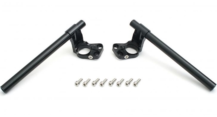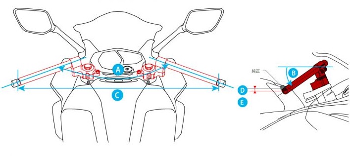 純正ハンドルより垂れ角をつけ、スポーツライディングに最適なポジションへ。付属するスペーサーを取りはずせばさらに低くなり、スポーツ走行を楽しめます。フロント荷重をかけやすい姿勢を実現するハンドルキット。ブラックアルマイトボルトオンスイッチ穴加工済高さ・角度調整可能MFJレギュレーション対応(ハンドルバー抜け防止ボルト付属)高さ調整スタンダード…ワインディングを楽しむスポーツライディングに最適ロー…ハンドル位置がさらに低くなり、サーキットでの“攻める走り”に最適※バーエンド(別売)、インナーウェイト(別売)対応A:開き角 : 115〜135°(純正128°)B:垂れ角 : 5°(純正-3°)C:幅(ハンドルエンド) : 650〜710mm(純正645mm)D:高さ(スペーサー有) : 純正-32mm(ハンドルエンド位置)E:高さ(スペーサー無) : 純正-42mm(ハンドルエンド位置)材質 : アルミ6061材※商品画像はサンプル画像となりますので、実際の商品内容とは異なりますので予めご了承くださいませ。
