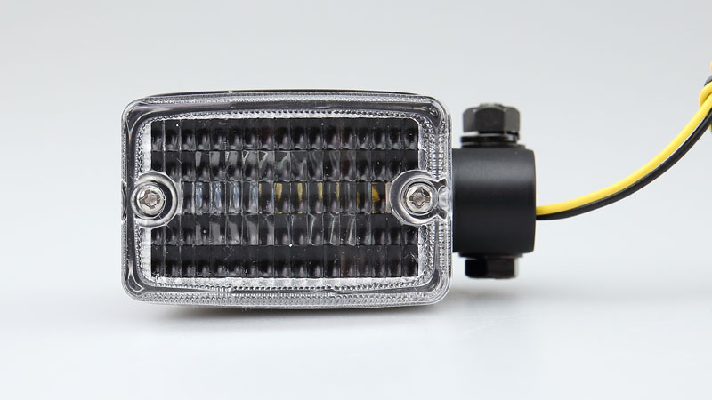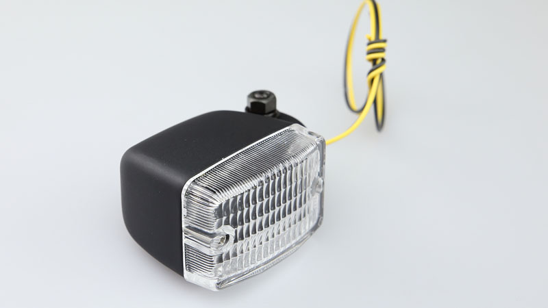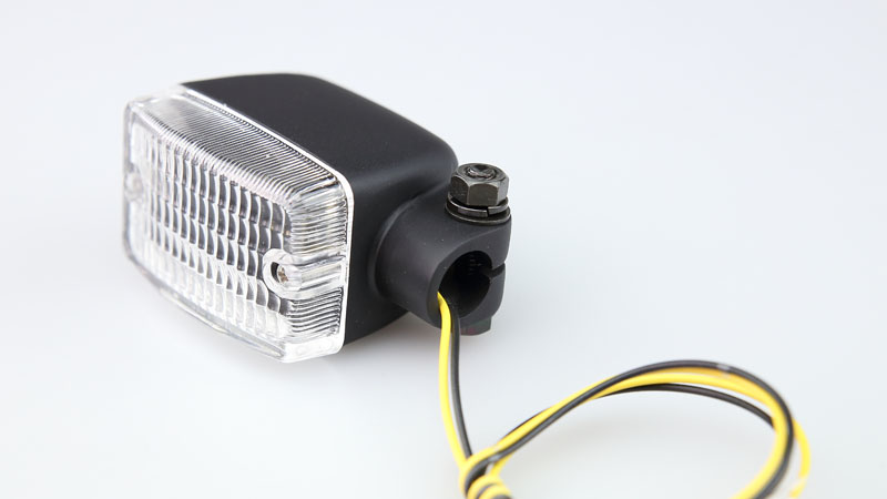シャフト状のステーにカシメるタイプのウインカー好評の#470角型ウインカーがアースコード付になってリニューアルバルブは付属されておりませんので別途G18タイプのアンバーバルブをご用意ください。【サイズ】60×40×59mm【ボディ材質】アルミダイキャスト【色(ボディ/レンズ)】ブラック/クリア【付属バルブ】無し(G18タイプがご使用可能)