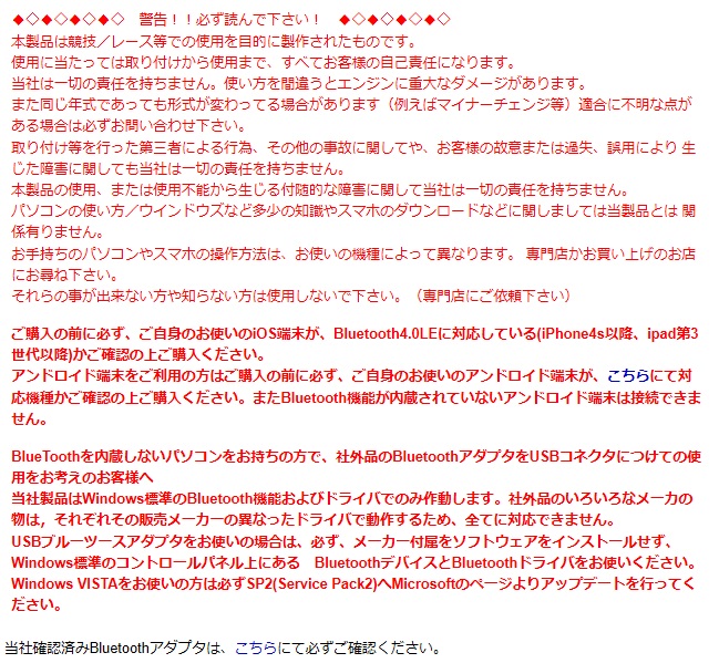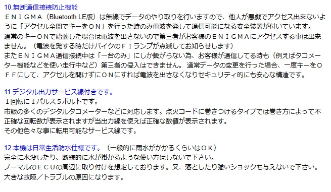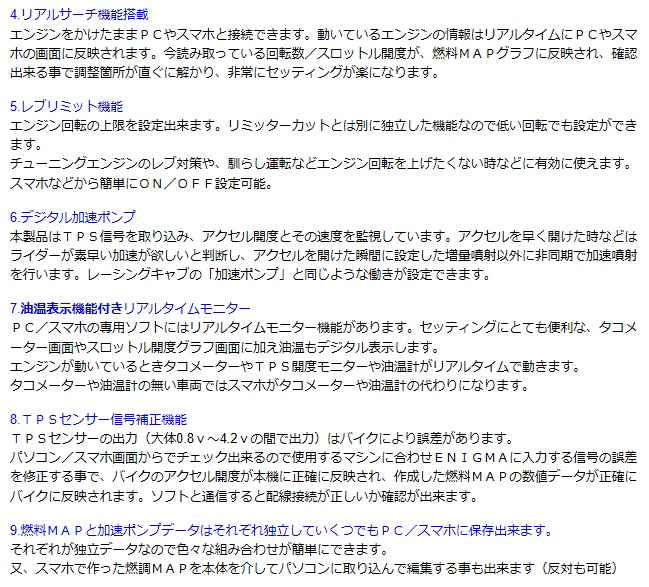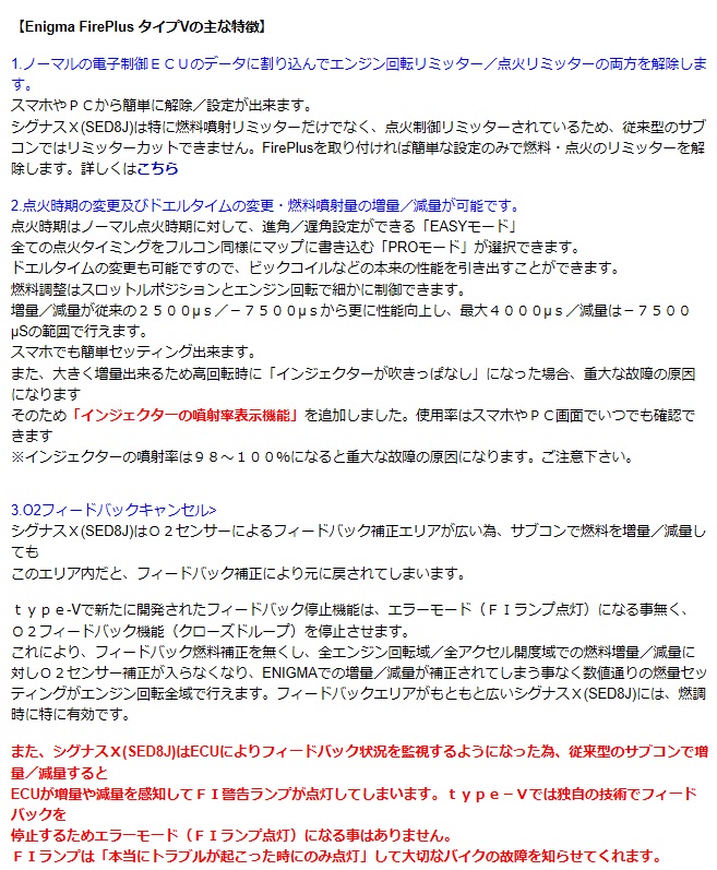 シグナスX(SED8J)のECUに完全カプラーONでワンタッチ取り付け可能なモデルです。ハンダ付作業などが不要の為、配線接続のミスが無く、作業はとても簡単で、ECUをカプラーに繋ぐだけです。 配線接続作業がない為、取り付け作業時間が大幅に短縮できます。シグナスX(SED8J)のノーマルECUに割り込み配線接続することにより、 優れた点火時期制御および燃料制御性能を発揮します。エンジンリミッターの解除や、今まで出来なかったさまざまな点火/燃調セッティングや変更が出来るようになります。また、O2センサーフィードバックエリアでは従来のサブコンで増量/減量してもO2フィードバック機能により、燃調が元に戻されてしまいますがタイプVでは新たに開発された新型回路により、エラー警告(FIランプ)が点灯する事無く、ECUによるフィードバック燃料補正を完全に停止させます。タイプVは従来のファイヤープラスより制御レスポンスが大きく向上しており、任意の増量/減量がイメージ通りに行えます。取り付けはECUにカプラーを差し込むだけのワンタッチ簡単装着です。取り付け方法(図解)はディルツ社HPより無料ダウンロード出来ます。取り付け後は、全ての操作をスマホやパソコンから無線接続で簡単に出来ます。PC用Enigma FirePlus type-V専用ソフトウェア(無料)から無線接続で操作ができます。iOS(iPhone)用アプリ又は、アンドロイド用アプリから全ての操作ができます。(スマホ用アプリは有料となります)ディルツ社ダウンロードページのリンク先からソフトやアプリをダウンロードしてください。Bluetooth /Bluetooth LE接続モデル アンドロイド/iOS両方に対応します※最新のスマホ対応情報はこちらアンドロイド端末、iOS端末とWindowsPCに接続可能です。MACには接続不可同じ燃調MAPをEnigmaを介してPCとスマホで共用出来ます。専用のEnigma FirePlus type-V操作用PCソフトウェアー/説明書はディルツ社HPより無料でPCにダウンロード出来ます。スマートフォン用アプリiOS版はApp Storeから、アンドロイド版はGoogle Playより基本アプリ(無料)をダウンロードその後、各車種専用の「車種データ(有料)」を選んでダウンロードして下さい。基本アプリ+車種(シグナスX(SED8J))データで使用出来る様になります。(詳しくは説明書をご覧下さい)※バイクを複数お持ちの方はスマホの基本アプリ1つに複数の「車種データ」を登録できます。※車種アプリは一度購入されると変更は出来ません各説明画面をよく読んでお間違えの無いようお願い致します。※一度購入されたアプリは機種変更後も同じIDで登録されていれば無料で再ダウンロードできます。注意※2型3型シグナスX、シグナスX(SEA5J)、BW'S125Fi、BW'S125(SEA6J)は適合外です。ECUが違うため使用できません。 各車種専用品をお求め下さい。