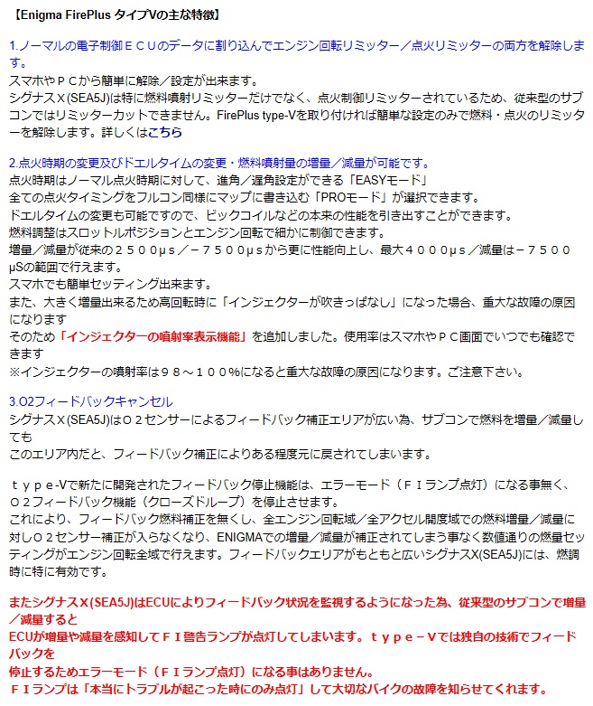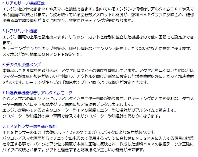 シグナスX(SEA5J)のノーマルECUに割り込み配線接続することにより、 優れた点火時期制御および燃料制御性能を発揮します。エンジンリミッターの解除や、今まで出来なかったさまざまな点火/燃調セッティングや変更が出来るようになります。また、O2センサーフィードバックエリアでは従来のサブコンで増量/減量してもO2フィードバック機能により、燃調が元に戻されてしまいますがタイプVでは新たに開発された新型回路により、エラー警告(FIランプ)が点灯する事無く、ECUによるフィードバック燃料補正を完全に停止させます。タイプVは従来のファイヤープラスより制御レスポンスが大きく向上しており、任意の増量/減量がイメージ通りに行えます。取り付けはご自分でECU配線にハンダ付け等で割り込み接続するスタンダードタイプです。(ワンタッチカプラーオンのRTFタイプもございます。)取り付け方法(図解)はディルツ社HPより無料ダウンロード出来ます。取り付け後は、全ての操作をスマホやパソコンから無線接続で簡単に出来ます。PC用Enigma FirePlus type-V専用ソフトウェア(無料)から無線接続で操作ができます。iOS(iPhone)用アプリ又は、アンドロイド用アプリから全ての操作ができます。(スマホ用アプリは有料となります)DILTSダウンロードページのリンク先からソフトやアプリをダウンロードしてください。Bluetooth /Bluetooth LE接続モデル アンドロイド/iOS両方に対応します※最新のスマホ対応情報はこちらアンドロイド端末、iOS端末とWindowsPCに接続可能です。MACには接続不可同じ燃調MAPをEnigmaを介してPCとスマホで共用出来ます。専用のEnigma FirePlus type-V操作用PCソフトウェアー/説明書はディルツ社HPより無料でPCにダウンロード出来ます。スマートフォン用アプリiOS版はApp Storeから、アンドロイド版はGoogle Playより基本アプリ(無料)をダウンロードその後、各車種専用の「車種データ(有料)」を選んでダウンロードして下さい。基本アプリ+車種(シグナスX(SEA5J))データで使用出来る様になります。(詳しくは説明書をご覧下さい)※バイクを複数お持ちの方はスマホの基本アプリ1つに複数の「車種データ」を登録できます。※車種アプリは一度購入されると変更は出来ません各説明画面をよく読んでお間違えの無いようお願い致します。※一度購入されたアプリは機種変更後も同じIDで登録されていれば無料で再ダウンロードできます。注意※2型3型シグナスX、シグナスX(SED8J)、BW'S125Fi、BW'S125(SED9J)は適合外です。ECUが違うため使用できません。 各車種専用品をお求め下さい。