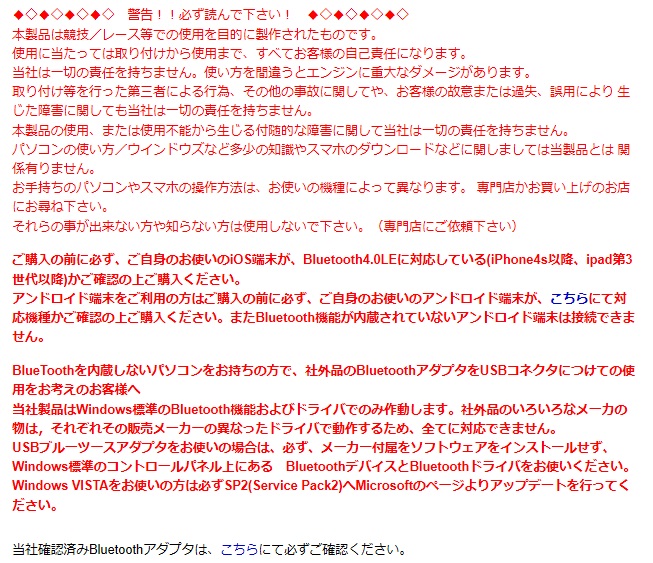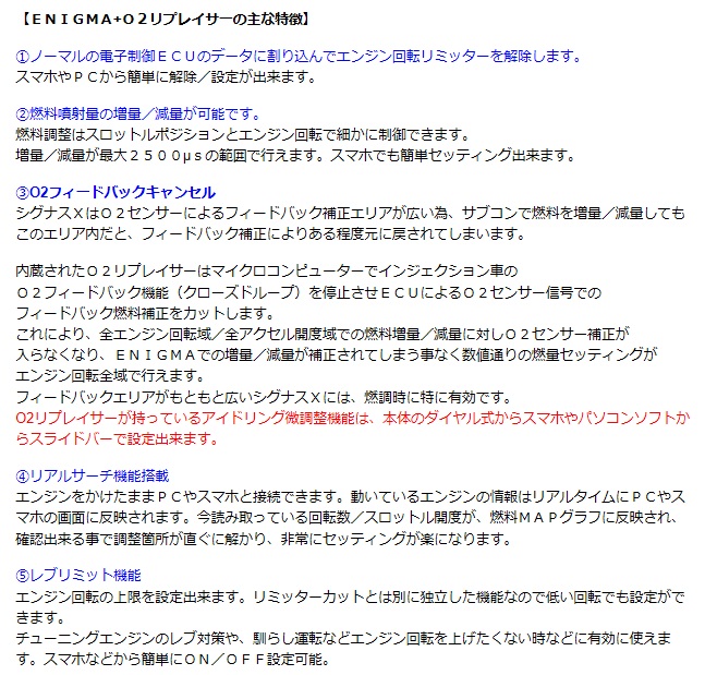 Enigma type Premium Ready to Fitです。シグナスXのECUに完全カプラーONでワンタッチ取り付け可能なモデルです。配線接続のミスが無く、作業はとても簡単で、ECUをカプラーに繋ぐだけです。O2リプレイサーをEnigmaに内臓している一体型で、コンパクトです。配線接続作業がない為、取り付け作業時間が大幅に短縮できます。 Bluetooth /Bluetooth LE接続モデル アンドロイド/iOS両方に対応しますインジェクションコントロールサブコン「NIGMA」に「O2リプレイサー」を内蔵したプレミアムバージョンを取り付けが簡単なカプラーONにしたパーフェクトバージョンです。アンドロイド端末、iOS端末とWindowsPCに接続可能です。MACには接続不可同じ燃調MAPをEnigmaを介してPCとスマホで共用出来ます。 当製品はインジェクション制御バイクのノーマルECUに割り込み接続することにより、優れた燃料制御性能を発揮します。今まで出来なかったさまざまなセッティングや変更が出来るようになります。また、O2センサーフィードバックエリアではサブコンで増量/減量しても、O2フィードバック機能により燃調がある程度元に戻されてしまいますが「O2リプレイサー」がフィードバック機能を停止させアイドリングから全ての回転域で確実に増量/減量を実現しパーフェクトな燃調が行えます。全てのコントロールはパソコン画面かスマートフォン(iOS端末またはアンドロイドスマホ)で行えます。専用のENIGMA操作用ソフトウェアー/説明書はディルツ社HPより無料でPCにダウンロード出来ます。スマートフォン用アプリiOS版はApp Storeから、アンドロイド版はGoogle Playよりダウンロード(有料)して下さい。(各説明画面をよく読んでお間違えの無いようお願い致します)注意※台湾初期のFIモデル(TPSセンサー無しモデル)は不可 ※後輪ディスクブレーキの台湾シグナスは不可※国内モデル(SE44J)はO2フィードバック機能を持たない為、リプレイサーは必要ありません。(取り付けても問題有りませんが機能しません。)※2015年11月発売の4型シグナス/後輪ディスクブレーキ仕様 (EBJ-SEA5J/E3T5E)には使用できません。