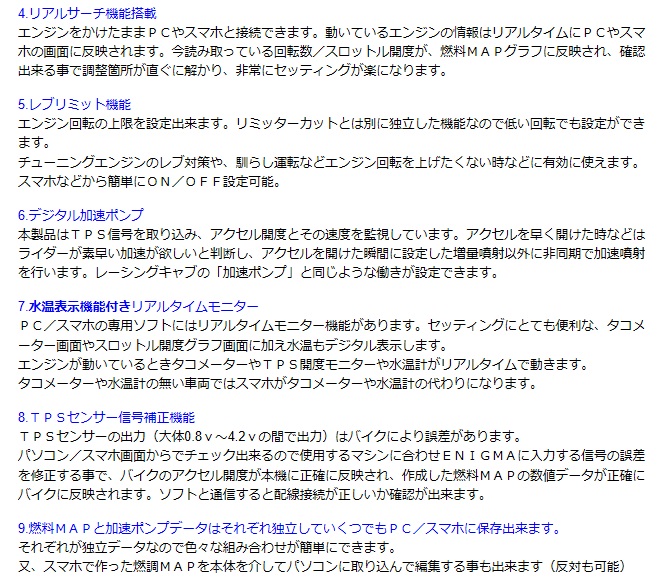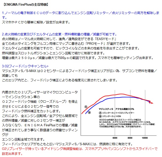 Enigma FirePlus type Ready to Fitです。マジェスティS/S-MAXのECUに完全カプラーONでワンタッチ取り付け可能なモデルです。ハンダ付作業などが不要の為、配線接続のミスが無く、作業はとても簡単で、ECUをカプラーに繋ぐだけです。 配線接続作業がない為、取り付け作業時間が大幅に短縮できます。インジェクション&点火コントロールサブコン「ENIGMA FirePlus」Bluetooth /Bluetooth LE接続モデル アンドロイド/iOS両方に対応しますアンドロイド端末、iOS端末とWindowsPCに接続可能です。MACには接続不可同じ燃調MAPをENIGMA FirePlusを介してPCとスマホで共用出来ます。当製品はインジェクション制御バイクのノーマルECUに割り込み接続することにより、 優れた点火時期制御および燃料制御性能を発揮します。今まで出来なかったさまざまな点火/燃料セッティングや変更が出来るようになります。全てのコントロールはパソコン画面かスマートフォン(iOS端末またはアンドロイドスマホ)で行えます。専用のENIGMA FirePlus操作用ソフトウェアー/説明書はディルツ社HPより無料でPCにダウンロード出来ます。スマートフォン用アプリiOS版はApp Storeから、アンドロイド版はGoogle Playよりダウンロード(有料)して下さい。(各説明画面をよく読んでお間違えの無いようお願い致します)注意※平成28年度国内排出ガス規制適合車については、調査中です。現在のところ適用外とさせていただきます。※海外で販売されているMajesty-S(125cc) には対応しません。