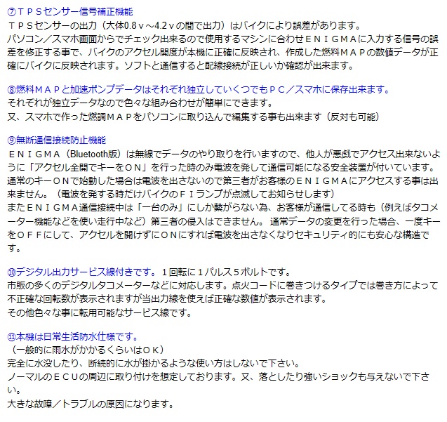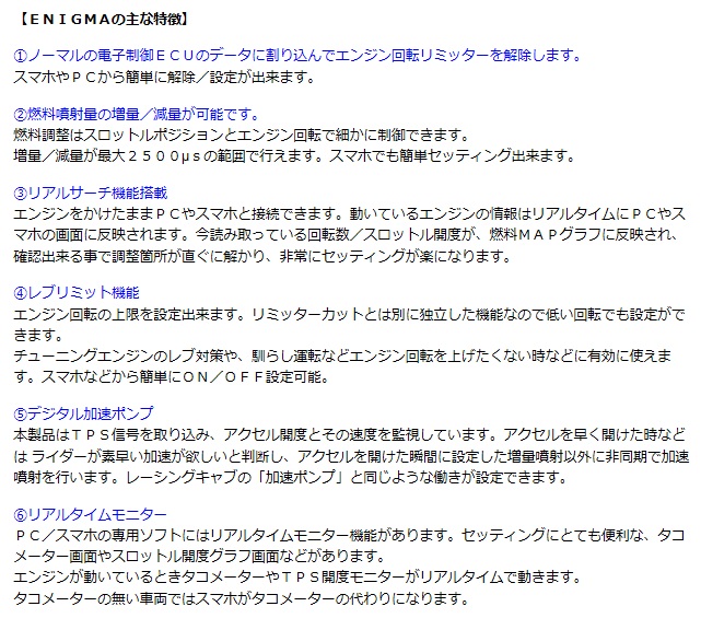 Enigma type Ready to Fitです。JOG-ZR/ VOXのECUに完全カプラーONでワンタッチ取り付け可能なモデルです。ハンダ付作業などが不要の為、配線接続のミスが無く、作業はとても簡単で、ECUをカプラーに「カチッ」と繋ぐだけです。配線接続作業がない為、取り付け作業時間が大幅に短縮できます。リプレイサー機能内蔵タイプは別製品です。インジェクションコントロールサブコン「ENIGMA」Bluetooth /Bluetooth LE接続モデル アンドロイド/iOS両方に対応しますアンドロイド端末、iOS端末とWindowsPCに接続可能です。MACには接続不可同じ燃調MAPをEnigmaを介してPCとスマホで共用出来ます。DILTS品はインジェクション制御バイクのノーマルECUにカプラーオン接続することにより、優れた燃料制御性能を発揮します。今まで出来なかったさまざまなセッティングや変更が出来るようになります。全てのコントロールはパソコン画面かスマートフォン(iOS端末またはアンドロイドスマホ)で行えます。専用のENIGMA操作用ソフトウェアー/説明書はディルツ社HPより無料でPCにダウンロード出来ます。スマートフォン用アプリiOS版はApp Storeから、アンドロイド版はGoogle Playよりダウンロード(有料)して下さい。(各説明画面をよく読んでお間違えの無いようお願い致します)