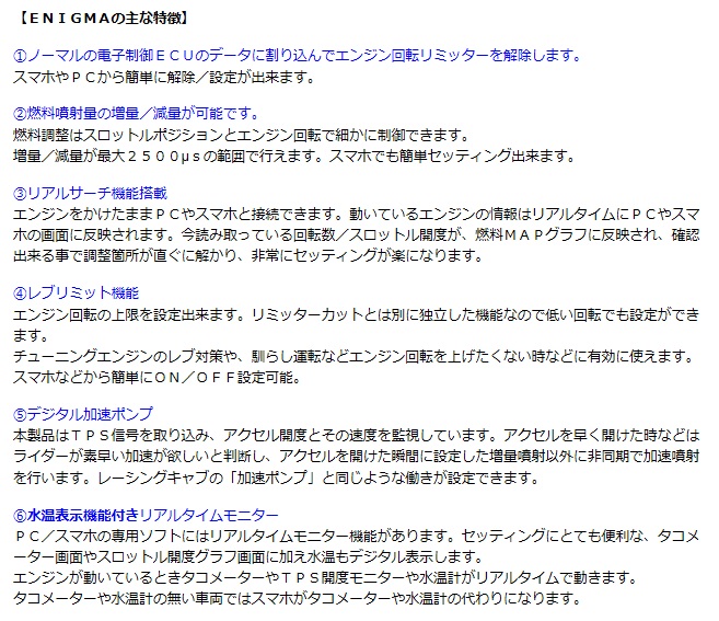 当製品はインジェクション制御バイクのノーマルECUに割り込み接続することにより、 優れた燃料制御性能を発揮します。